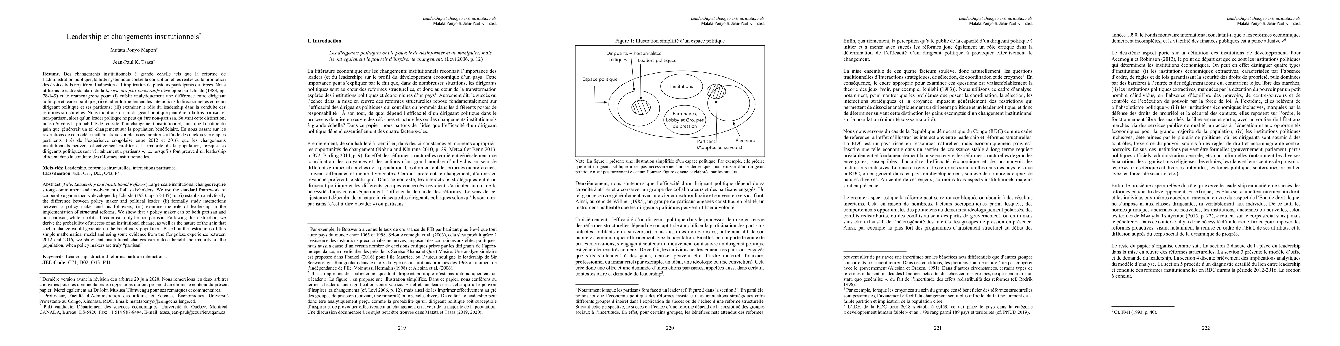 Large-scale institutional changes require strong commitment and involvement of all stakeholders. We use the standard framework of cooperative game theory developed by Ichiishi (1983, pp. 78-149) to: (i) establish analytically the difference between policy maker and political leader; (ii) formally study interactions between a policy maker and his followers; (iii) examine the role of leadership in the implementation of structural reforms. We show that a policy maker can be both partisan and non-partisan, while a political leader can only be non-partisan. Following this distinction, we derive the probability of success of an institutional change, as well as the nature of the gain that such a change would generate on the beneficiary population. Based on the restrictions of this simple mathematical model and using some evidence from the Congolese experience between 2012 and 2016, we show that institutional changes can indeed benefit the majority of the population, when policy makers are truly partisan.