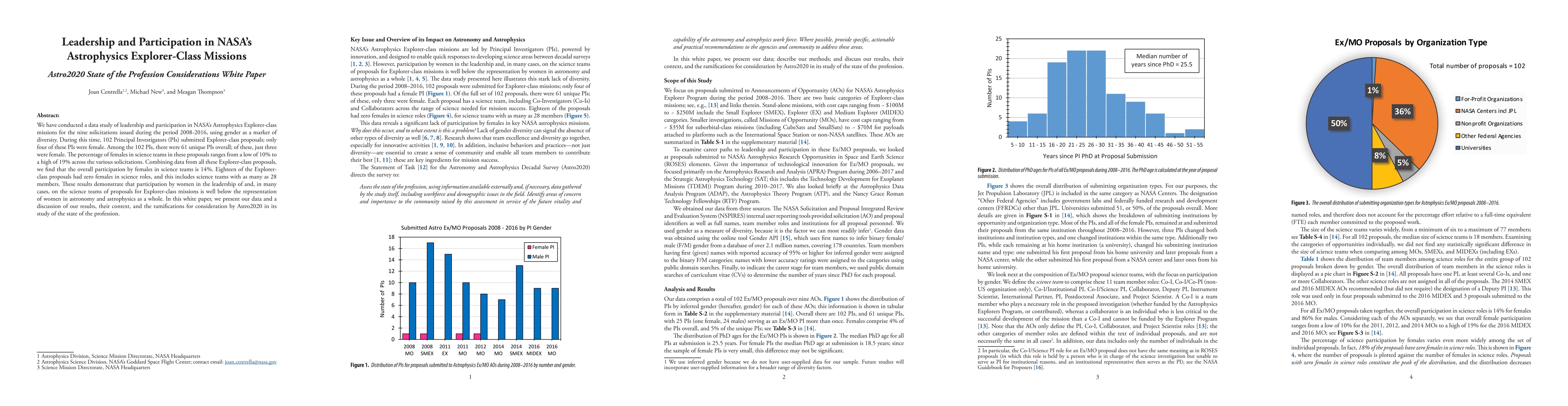 We have conducted a data study of leadership and participation in NASA's Astrophysics Explorer-class missions for the nine solicitations issued during the period 2008-2016, using gender as a marker of diversity. During this time, 102 Principal Investigators (PIs) submitted Explorer-class proposals; only four of these PIs were female. Among the 102 PIs, there were 61 unique PIs overall; of these, just three were female. The percentage of females in science teams in these proposals ranges from a low of 10% to a high of 19% across the various solicitations. Combining data from all these Explorer-class proposals, we find that the overall participation by females in science teams is 14%. Eighteen of the Explorer-class proposals had zero females in science roles, and this includes science teams with as many as 28 members. These results demonstrate that participation by women in the leadership of and, in many cases, on the science teams of proposals for Explorer-class missions is well below the representation of women in astronomy and astrophysics as a whole. In this white paper, we present our data and a discussion of our results, their context, and the ramifications for consideration by Astro2020 in its study of the state of the profession.