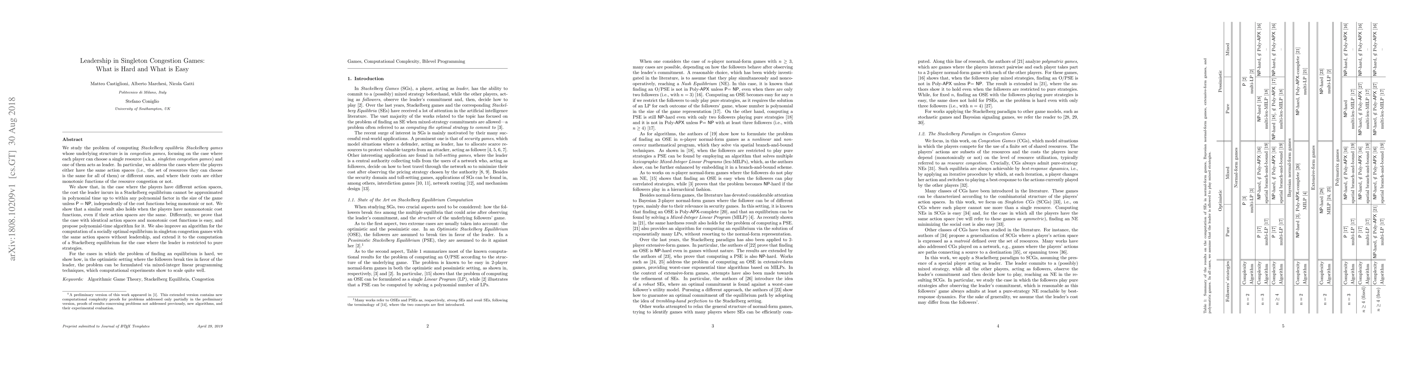 Research finds that computing Stackelberg equilibria in singleton congestion games is challenging when players have different action spaces, but can be solved efficiently with identical action spaces and monotonic cost functions.