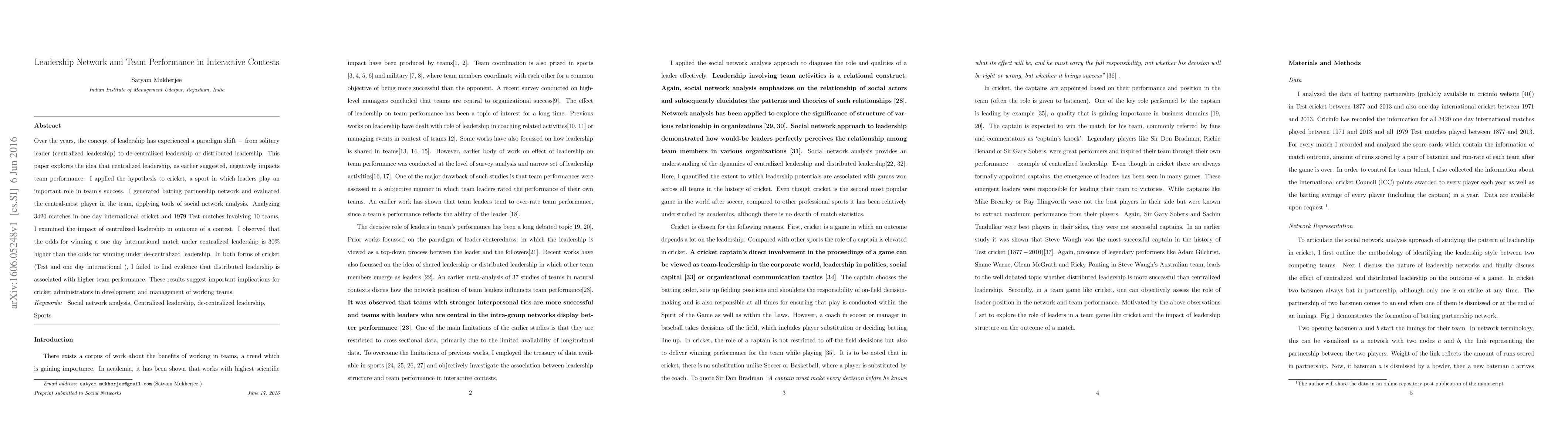This study investigates the impact of centralized versus decentralized leadership on team performance in cricket, using social network analysis on 3420 one day international matches and 1979 Test matches. It finds that centralized leadership increases the odds of winning one day international matches by 30%, but does not support the notion that distributed leadership enhances team performance.