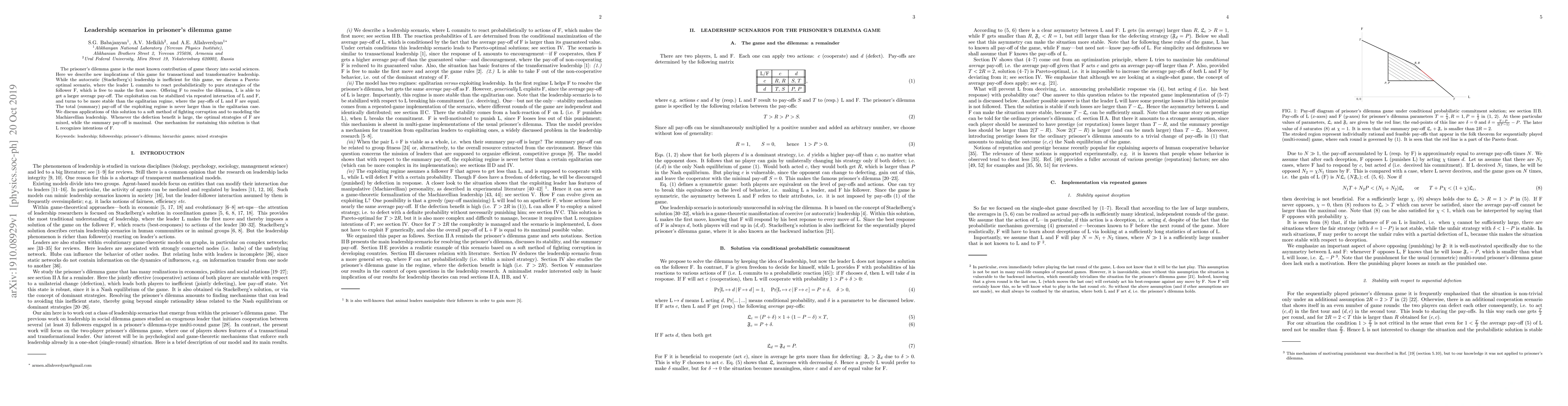A leadership scenario in prisoner's dilemma game suggests that a probabilistic response from leader L can lead to a larger average pay-off than traditional autocratic or egalitarian approaches, with stability achieved through repeated interaction.