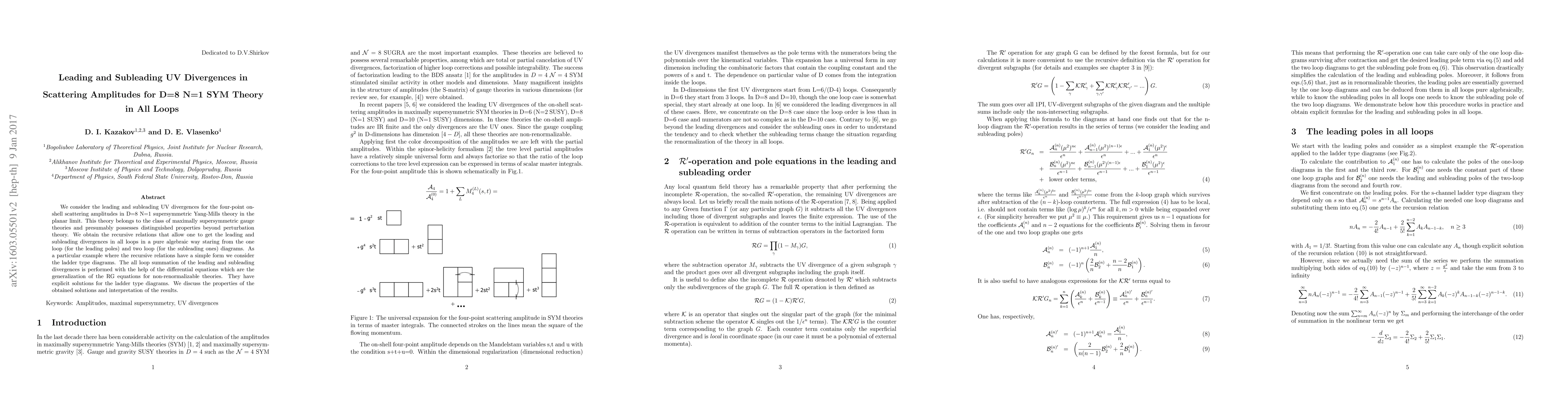 This paper investigates the leading and subleading ultraviolet divergences in four-point scattering amplitudes for D=8 N=1 supersymmetric Yang-Mills theory using spinor-helicity and superfield formalism. It derives recursive relations for these divergences in all loops, particularly focusing on ladder diagrams, and employs differential equations to sum these divergences, providing insights into the theory's properties.