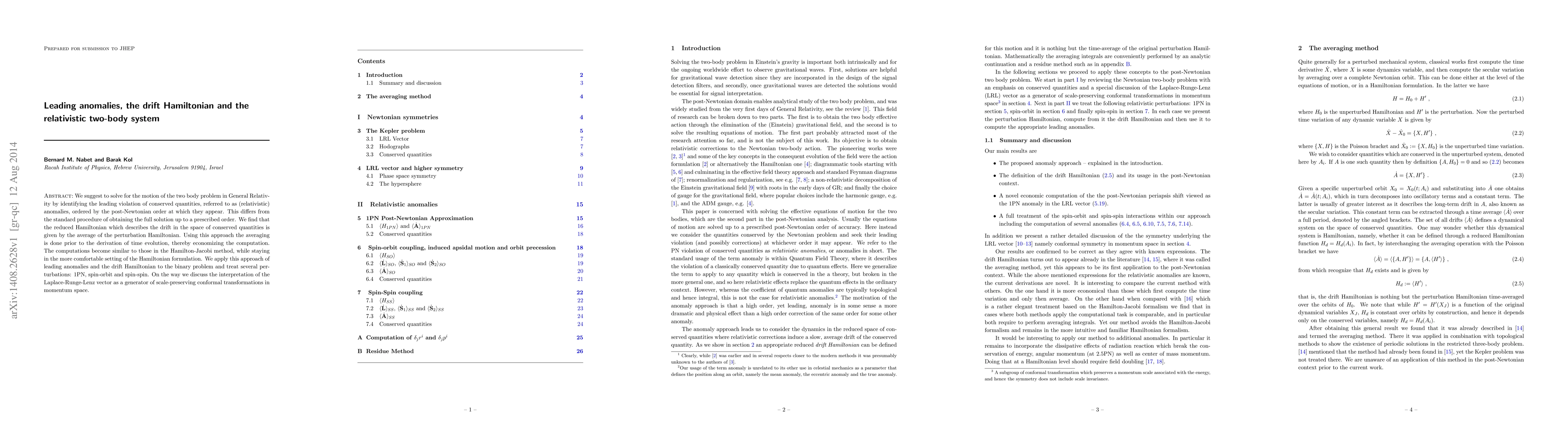 The paper introduces a novel approach to solving the two-body problem in General Relativity by focusing on leading anomalies and employing a drift Hamiltonian, which simplifies computations and aligns with the Hamilton-Jacobi method.