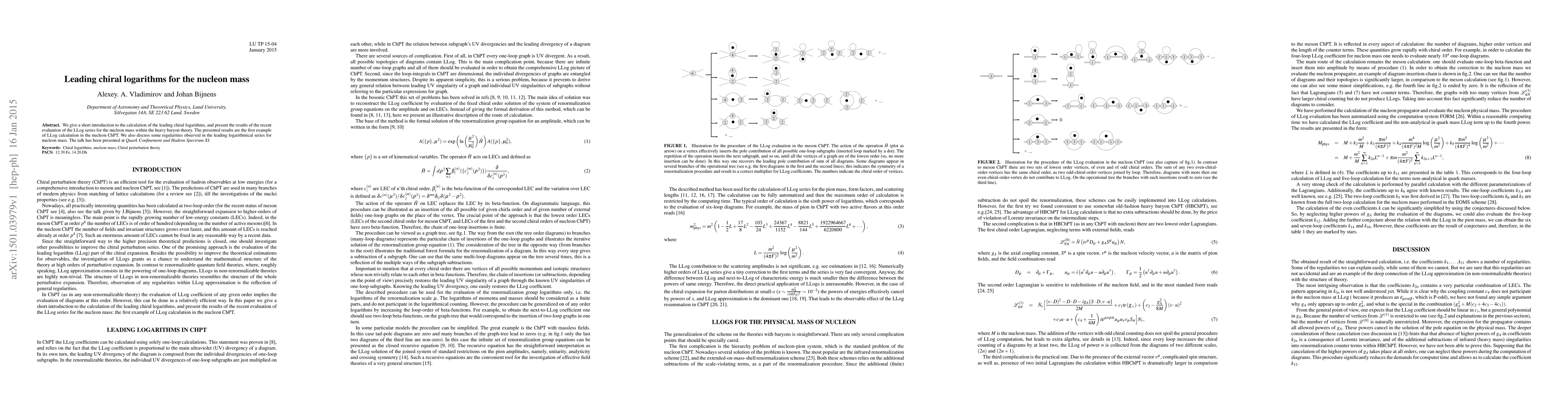 We give a short introduction to the calculation of the leading chiral logarithms, and present the results of the recent evaluation of the leading logarithm series for the nucleon mass within the heavy baryon theory. The presented results are the first example of leading logarithm calculation in the nucleon ChPT. We also discuss some regularities observed in the leading logarithmical series for nucleon mass. The talk has been presented at "Quark Confinement and the Hadron Spectrum XI".