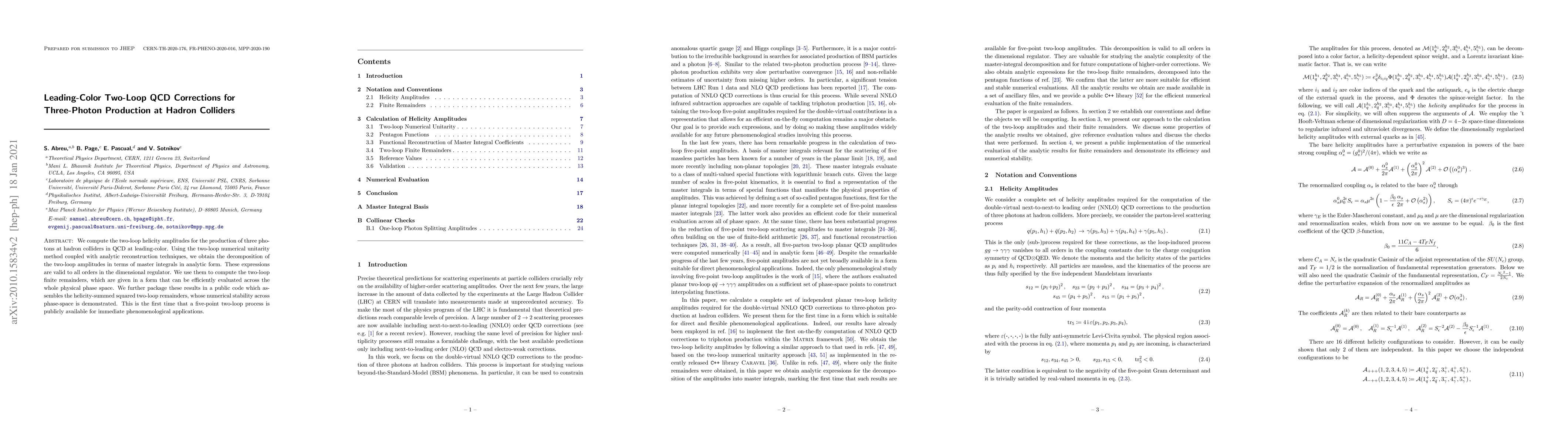 We compute the two-loop helicity amplitudes for the production of three photons at hadron colliders in QCD at leading-color. Using the two-loop numerical unitarity method coupled with analytic reconstruction techniques, we obtain the decomposition of the two-loop amplitudes in terms of master integrals in analytic form. These expressions are valid to all orders in the dimensional regulator. We use them to compute the two-loop finite remainders, which are given in a form that can be efficiently evaluated across the whole physical phase space. We further package these results in a public code which assembles the helicity-summed squared two-loop remainders, whose numerical stability across phase-space is demonstrated. This is the first time that a five-point two-loop process is publicly available for immediate phenomenological applications.