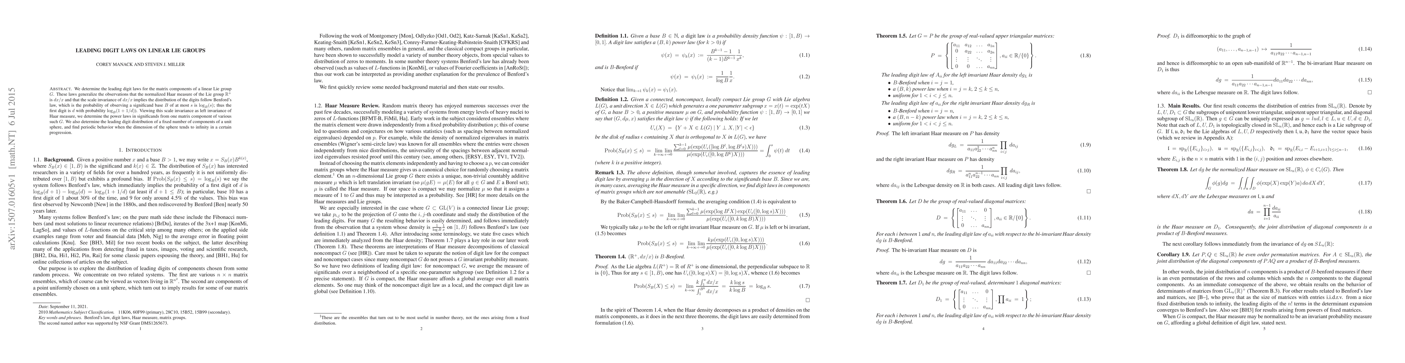 We determine the leading digit laws for the matrix components of a linear Lie group $G$. These laws generalize the observations that the normalized Haar measure of the Lie group $\mathbb{R}^+$ is $dx/x$ and that the scale invariance of $dx/x$ implies the distribution of the digits follow Benford's law, which is the probability of observing a significand base $B$ of at most $s$ is $\log_B(s)$; thus the first digit is $d$ with probability $\log_B(1 + 1/d)$). Viewing this scale invariance as left invariance of Haar measure, we determine the power laws in significands from one matrix component of various such $G$. We also determine the leading digit distribution of a fixed number of components of a unit sphere, and find periodic behavior when the dimension of the sphere tends to infinity in a certain progression.