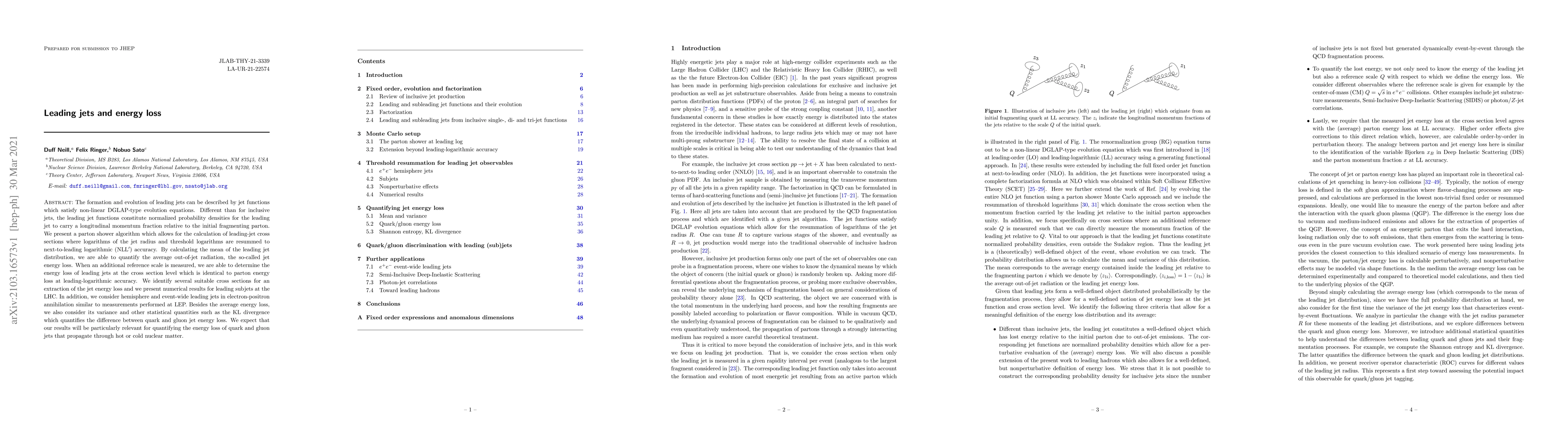 The formation and evolution of leading jets can be described by jet functions which satisfy non-linear DGLAP-type evolution equations. Different than for inclusive jets, the leading jet functions constitute normalized probability densities for the leading jet to carry a longitudinal momentum fraction relative to the initial fragmenting parton. We present a parton shower algorithm which allows for the calculation of leading-jet cross sections where logarithms of the jet radius and threshold logarithms are resummed to next-to-leading logarithmic (NLL$'$) accuracy. By calculating the mean of the leading jet distribution, we are able to quantify the average out-of-jet radiation, the so-called jet energy loss. When an additional reference scale is measured, we are able to determine the energy loss of leading jets at the cross section level which is identical to parton energy loss at leading-logarithmic accuracy. We identify several suitable cross sections for an extraction of the jet energy loss and we present numerical results for leading subjets at the LHC. In addition, we consider hemisphere and event-wide leading jets in electron-positron annihilation similar to measurements performed at LEP. Besides the average energy loss, we also consider its variance and other statistical quantities such as the KL divergence which quantifies the difference between quark and gluon jet energy loss. We expect that our results will be particularly relevant for quantifying the energy loss of quark and gluon jets that propagate through hot or cold nuclear matter.