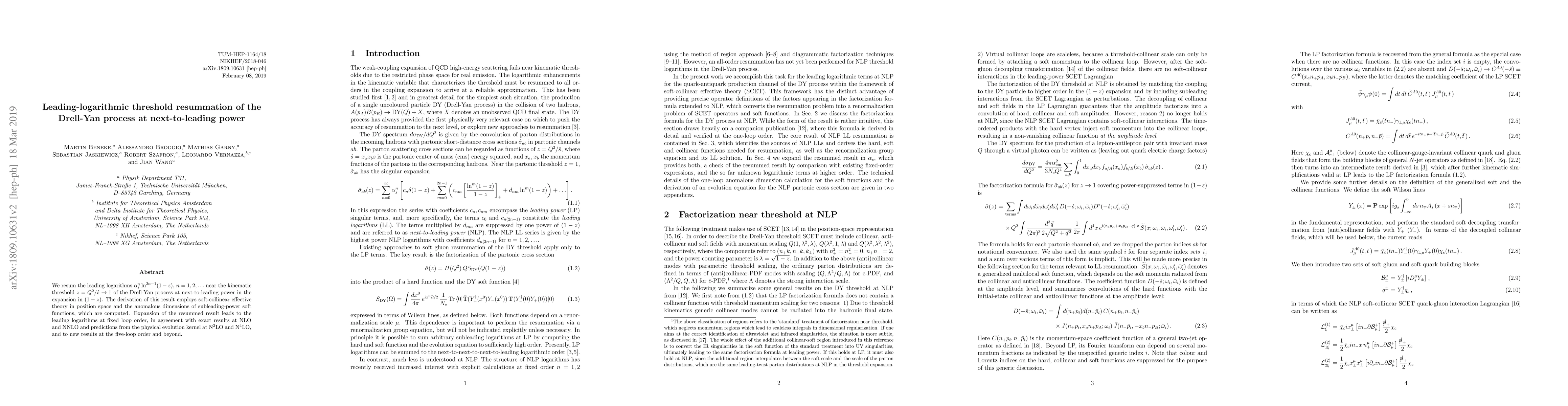 This paper presents a leading-logarithmic threshold resummation for the Drell-Yan process at next-to-leading power using soft-collinear effective theory. The study computes new results at five-loop order and beyond, aligning with exact results at NLO, NNLO, and predictions from the physical evolution kernel at N$^3$LO and N$^4$LO.