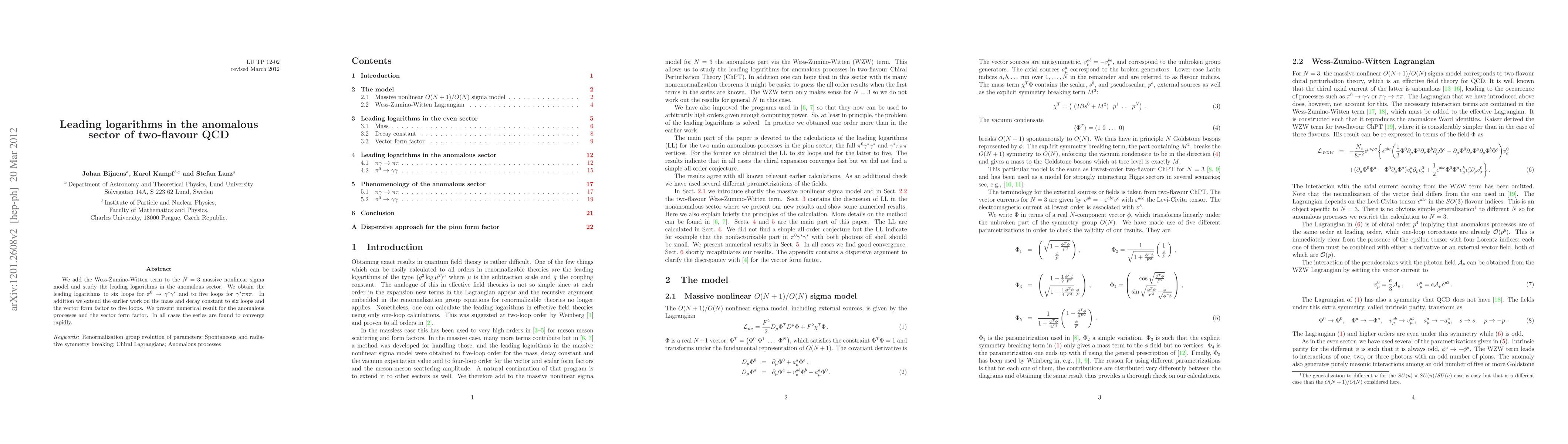 This paper calculates leading logarithms in QCD processes using the N=3 massive nonlinear sigma model, finding rapid convergence in results for six-loop calculations of neutral pion decay into gamma-gamma and gamma-pi-π processes, as well as a five-loop calculation of the vector form factor.