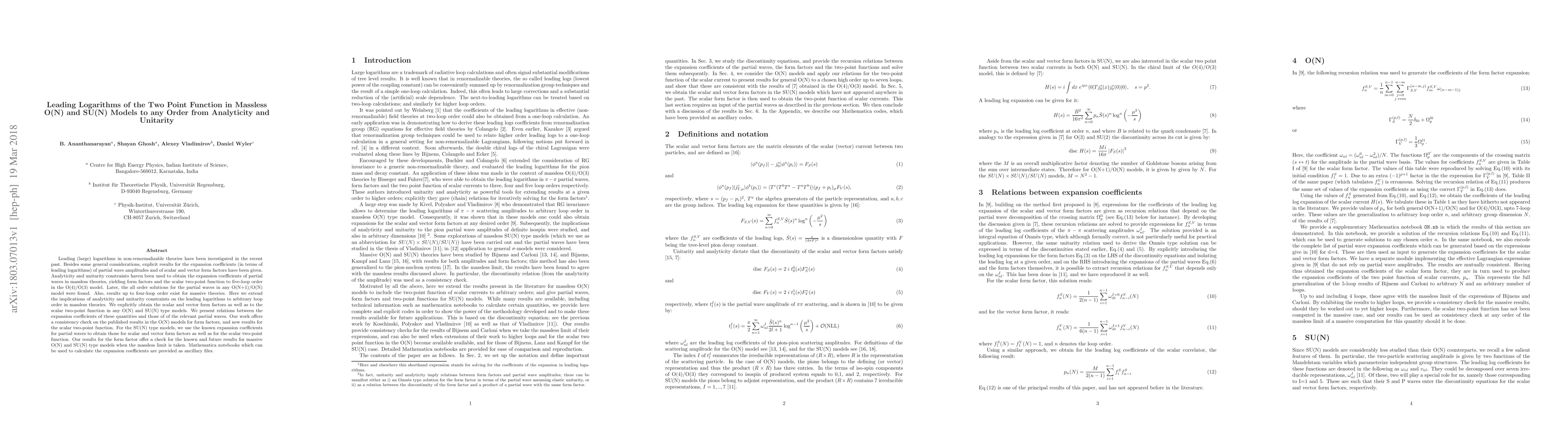 This paper extends the use of analyticity and unitarity constraints to determine leading logarithms in massless O(N) and SU(N) models to any order, providing explicit results for scalar and vector form factors and the scalar two-point function. It also offers consistency checks for existing results and provides Mathematica notebooks for calculating expansion coefficients.