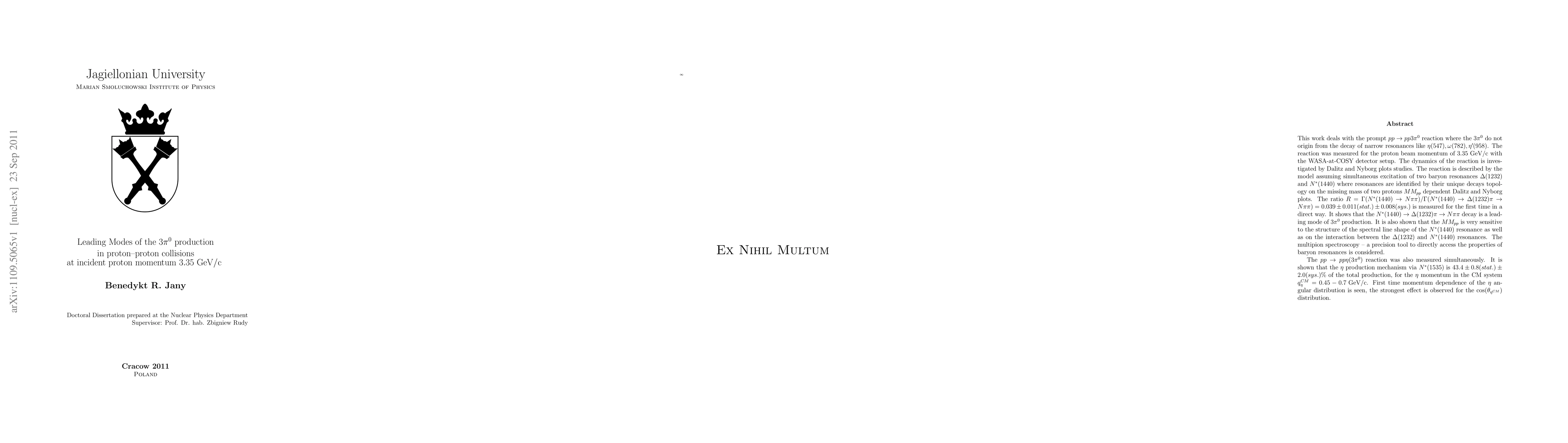 This work deals with the prompt pp-->pp3pi0 reaction where the 3pi0 do not origin from the decay of narrow resonances like \eta(547), \omega(782), \eta'(958). The reaction was measured for the proton beam momentum of 3.35GeV/c with the WASA-at-COSY detector setup. The dynamics of the reaction is investigated by Dalitz and Nyborg plots studies. The reaction is described by the model assuming simultaneous excitation of two baryon resonances \Delta(1232) and N*(1440) where resonances are identified by their unique decays topology on the missing mass of two protons MMpp dependent Dalitz and Nyborg plots. The ratio R=\Gamma(N*(1440)->N\pi\pi)/\Gamma(N*(1440)->\Delta(1232)\pi->N\pi\pi)= 0.039 +- 0.011(stat.) +- 0.008(sys.) is measured for the first time in a direct way. It shows that the {N*(1440)->\Delta(1232)\pi->N\pi\pi} decay is a leading mode of 3pi0 production. It is also shown that the MMpp is very sensitive to the structure of the spectral line shape of the N*(1440) resonance as well as on the interaction between the \Delta(1232) and N*(1440) resonances. The multipion spectroscopy - a precision tool to directly access the properties of baryon resonances is considered. The pp-->pp\eta(3pi0) reaction was also measured simultaneously. It is shown that the {\eta} production mechanism via N*(1535) is 43.4 +- 0.8(stat.) +- 2.0(sys.) of the total production, for the {\eta} momentum in the CM system q_\eta^CM=0.45-0.7GeV/c. First time momentum dependence of the {\eta} angular distribution is seen, the strongest effect is observed for the cos(\theta_\eta^CM) distribution.