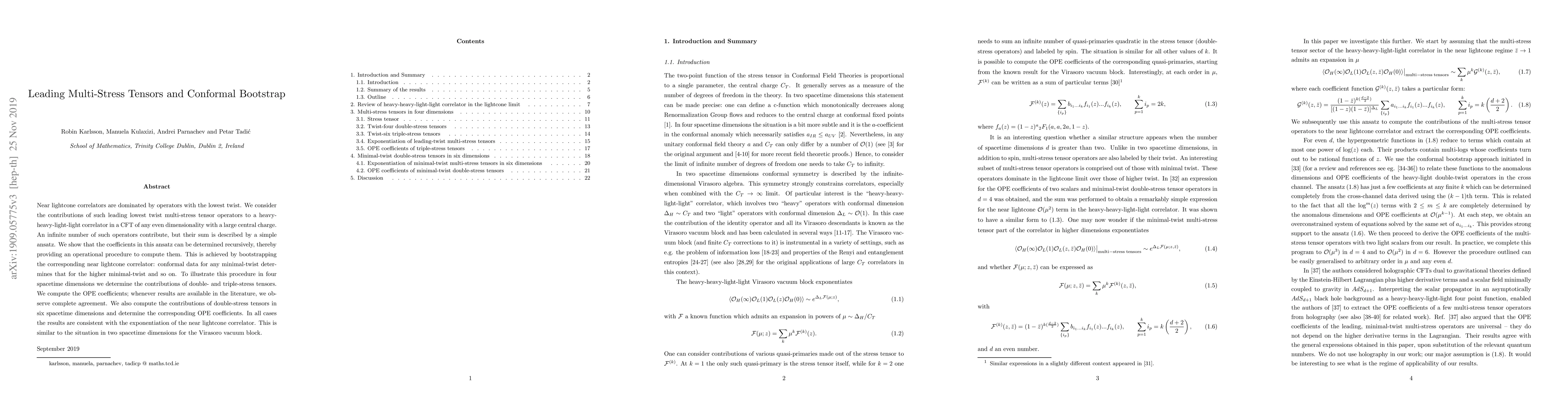 Near lightcone correlators are dominated by operators with the lowest twist. We consider the contributions of such leading lowest twist multi-stress tensor operators to a heavy-heavy-light-light correlator in a CFT of any even dimensionality with a large central charge. An infinite number of such operators contribute, but their sum is described by a simple ansatz. We show that the coefficients in this ansatz can be determined recursively, thereby providing an operational procedure to compute them. This is achieved by bootstrapping the corresponding near lightcone correlator: conformal data for any minimal-twist determines that for the higher minimal-twist and so on. To illustrate this procedure in four spacetime dimensions we determine the contributions of double- and triple-stress tensors. We compute the OPE coefficients; whenever results are available in the literature, we observe complete agreement. We also compute the contributions of double-stress tensors in six spacetime dimensions and determine the corresponding OPE coefficients. In all cases the results are consistent with the exponentiation of the near lightcone correlator. This is similar to the situation in two spacetime dimensions for the Virasoro vacuum block.