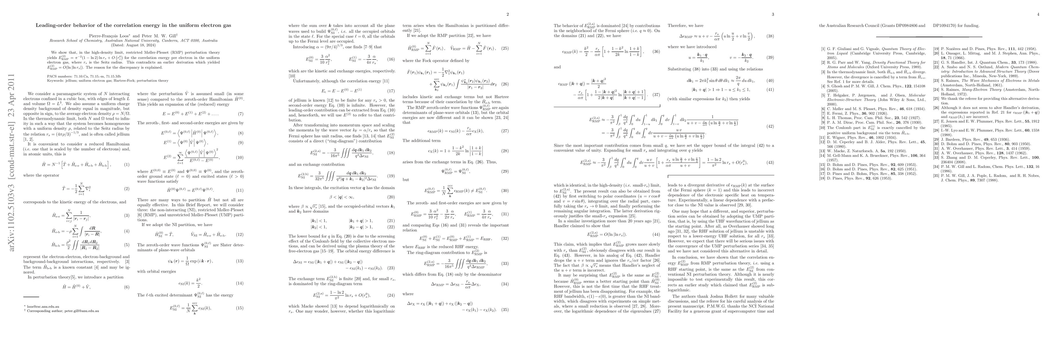 We show that, in the high-density limit, restricted M{\o}ller-Plesset (RMP) perturbation theory yields $E_{\text{RMP}}^{(2)} = \pi^{-2}(1-\ln 2) \ln r_s + O(r_s^0)$ for the correlation energy per electron in the uniform electron gas, where $r_s$ is the Seitz radius. This contradicts an earlier derivation which yielded $E_{\text{RMP}}^{(2)} = O(\ln|\ln r_s|)$. The reason for the discrepancy is explained.