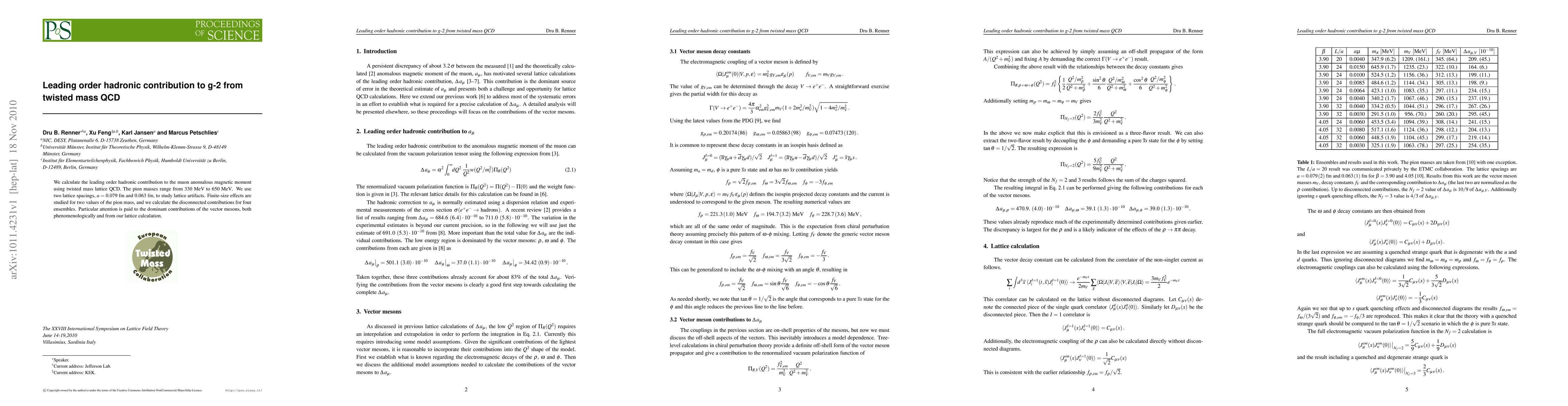 Researchers calculate the leading order hadronic contribution to the muon anomalous magnetic moment using twisted mass lattice QCD, focusing on vector mesons and studying lattice artifacts.