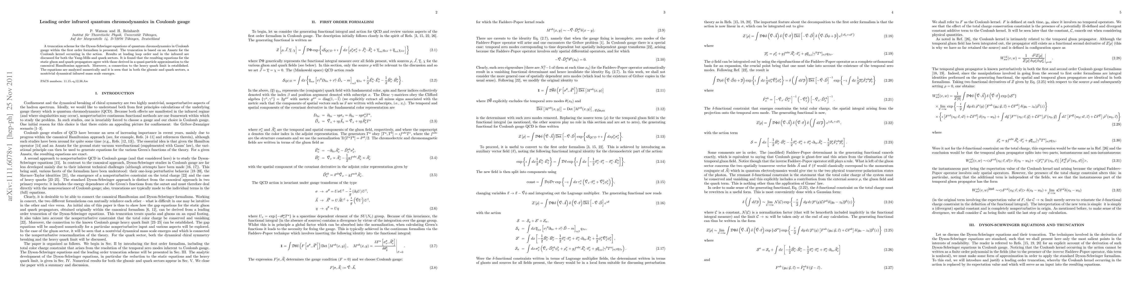 A truncation scheme for the Dyson-Schwinger equations of quantum chromodynamics in Coulomb gauge within the first order formalism is presented. The truncation is based on an Ansatz for the Coulomb kernel occurring in the action. Results at leading loop order and in the infrared are discussed for both the Yang-Mills and quark sectors. It is found that the resulting equations for the static gluon and quark propagators agree with those derived in a quasi-particle approximation to the canonical Hamiltonian approach. Moreover, a connection to the heavy quark limit is established. The equations are analyzed numerically and it is seen that in both the gluonic and quark sectors, a nontrivial dynamical infrared mass scale emerges.