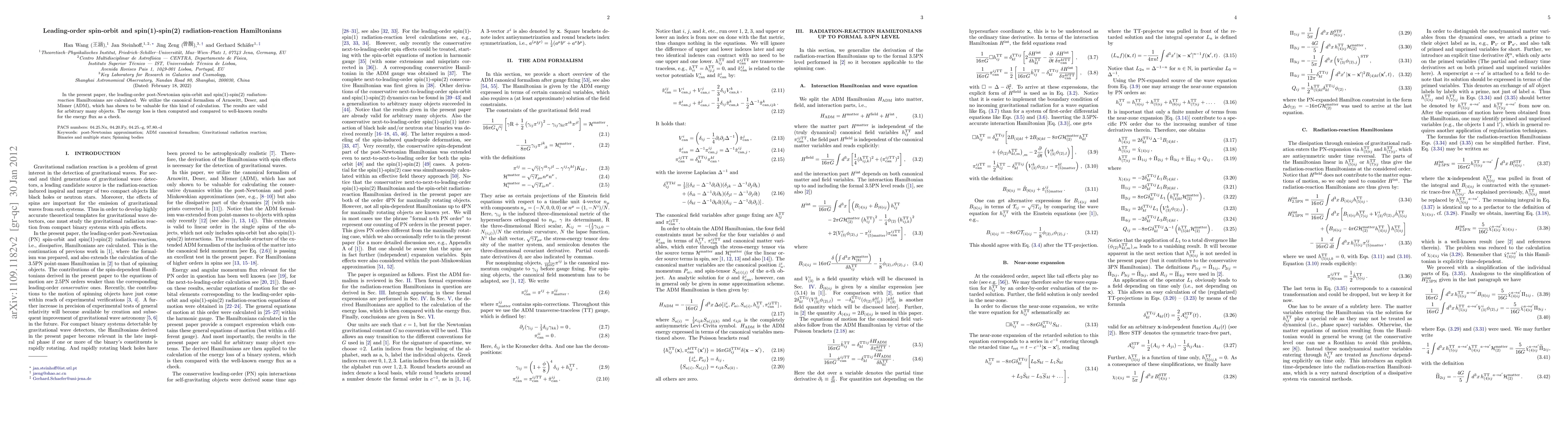 In the present paper, the leading-order post-Newtonian spin-orbit and spin(1)-spin(2) radiation-reaction Hamiltonians are calculated. We utilize the canonical formalism of Arnowitt, Deser, and Misner (ADM), which has shown to be valuable for this kind of calculation. The results are valid for arbitrary many objects. The energy loss is then computed and compared to well-known results for the energy flux as a check.