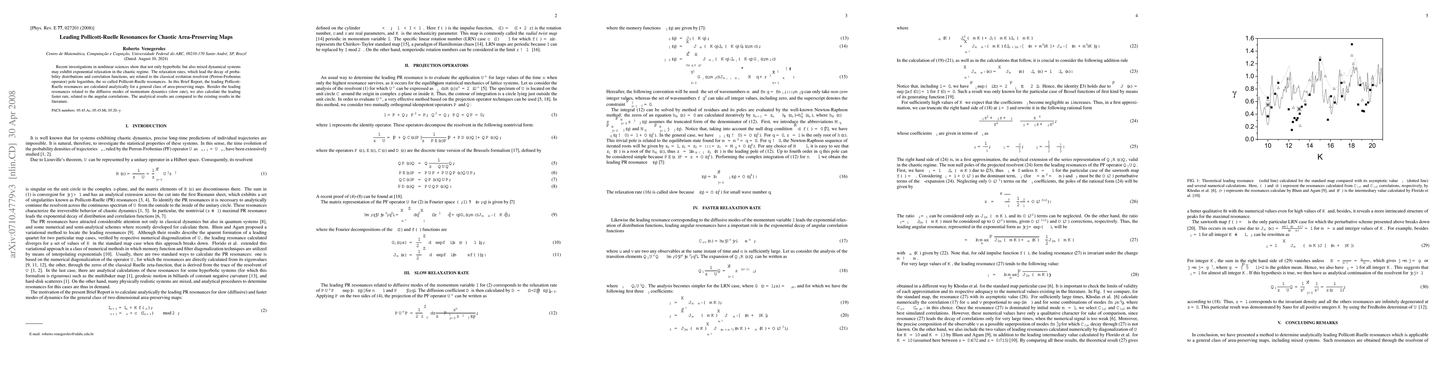 This research paper analytically calculates leading Pollicott-Ruelle resonances for chaotic area-preserving maps, identifying both the slow decay rate related to momentum dynamics and the faster rate linked to angular correlations. The findings are benchmarked against existing literature.