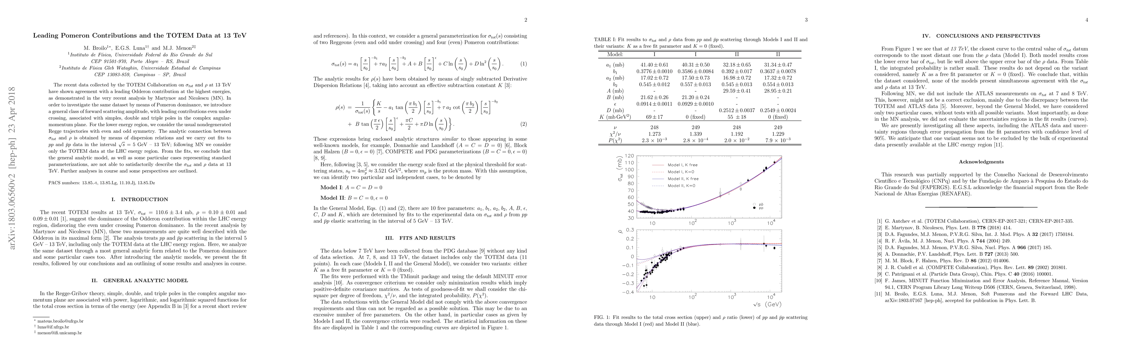 The recent data by the TOTEM Collaboration on $\sigma_{tot}$ and $\rho$ at 13 TeV, have shown agreement with a leading Odderon contribution at the highest energies, as demonstrated in the very recent analysis by Martynov and Nicolescu (MN). In order to investigate the same dataset by means of Pomeron dominance, we introduce a general class of forward scattering amplitude, with leading contributions even under crossing, associated with simple, double and triple poles in the complex angular momentum plane. For the lower energy region, we consider the usual non-degenerated Regge trajectories, with even and odd symmetry. The analytic connection between $\sigma_{tot}$ and $\rho$ is obtained by means of dispersion relations and we carry out fits to $pp$ and $\bar{p}p$ data in the interval $\sqrt{s}=5$ GeV - 13 TeV; following MN we consider only the TOTEM data at the LHC energy region. From the fits, we conclude that the general analytic model, as well as some particular cases representing standard parameterizations, are not able to describe satisfactorily the $\sigma_{tot}$ and $\rho$ data at 13 TeV. Further analyses in course and some perspectives are outlined.