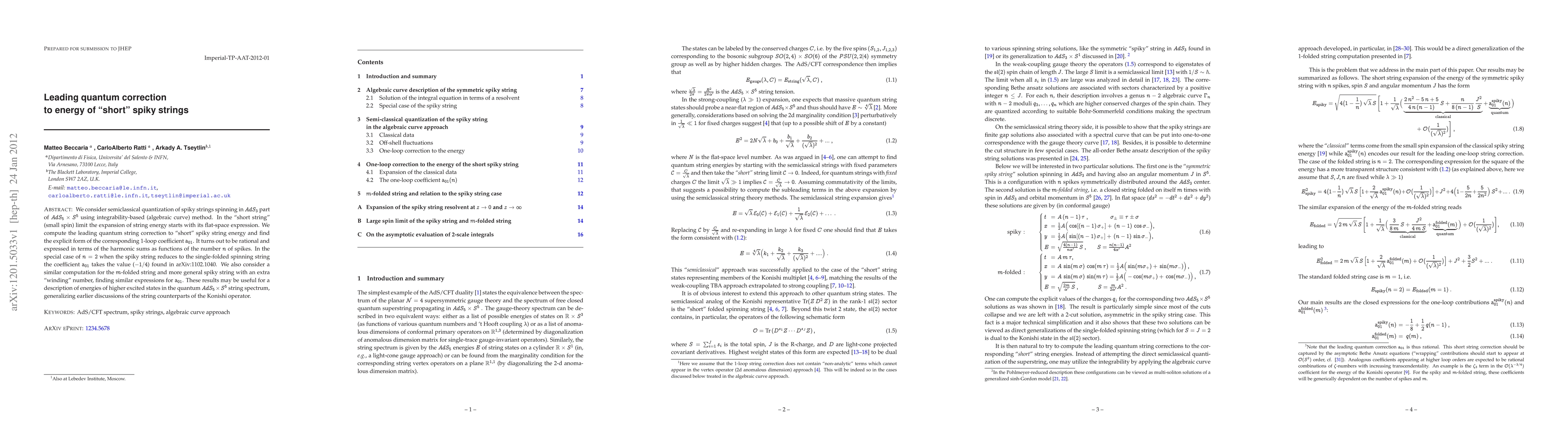 This paper computes the leading quantum correction to the energy of "short" spiky strings in AdS_5 X S^5 using an integrability-based method. The leading coefficient a_01 is found to be rational and expressed in terms of harmonic sums, with specific values for n=2 and m-folded strings.