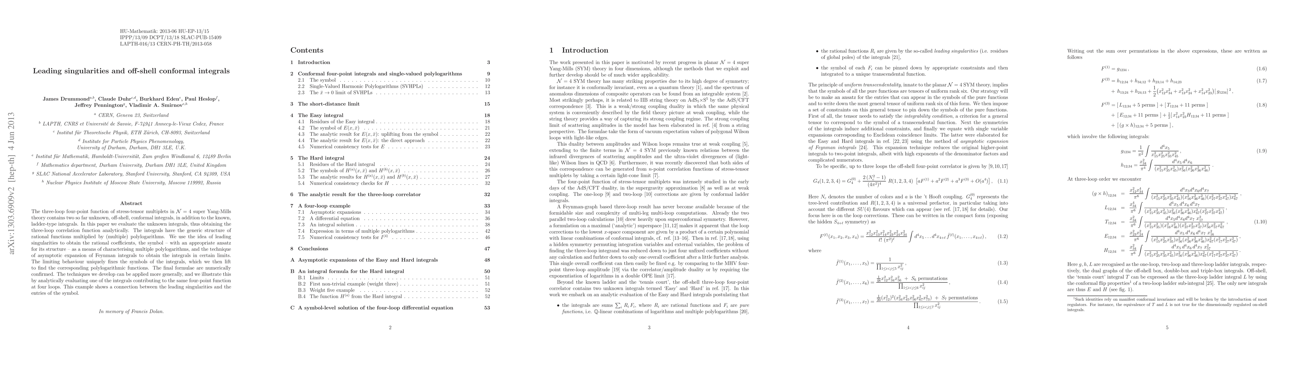 The three-loop four-point function of stress-tensor multiplets in N=4 super Yang-Mills theory contains two so far unknown, off-shell, conformal integrals, in addition to the known, ladder-type integrals. In this paper we evaluate the unknown integrals, thus obtaining the three-loop correlation function analytically. The integrals have the generic structure of rational functions multiplied by (multiple) polylogarithms. We use the idea of leading singularities to obtain the rational coefficients, the symbol - with an appropriate ansatz for its structure - as a means of characterising multiple polylogarithms, and the technique of asymptotic expansion of Feynman integrals to obtain the integrals in certain limits. The limiting behaviour uniquely fixes the symbols of the integrals, which we then lift to find the corresponding polylogarithmic functions. The final formulae are numerically confirmed. The techniques we develop can be applied more generally, and we illustrate this by analytically evaluating one of the integrals contributing to the same four-point function at four loops. This example shows a connection between the leading singularities and the entries of the symbol.