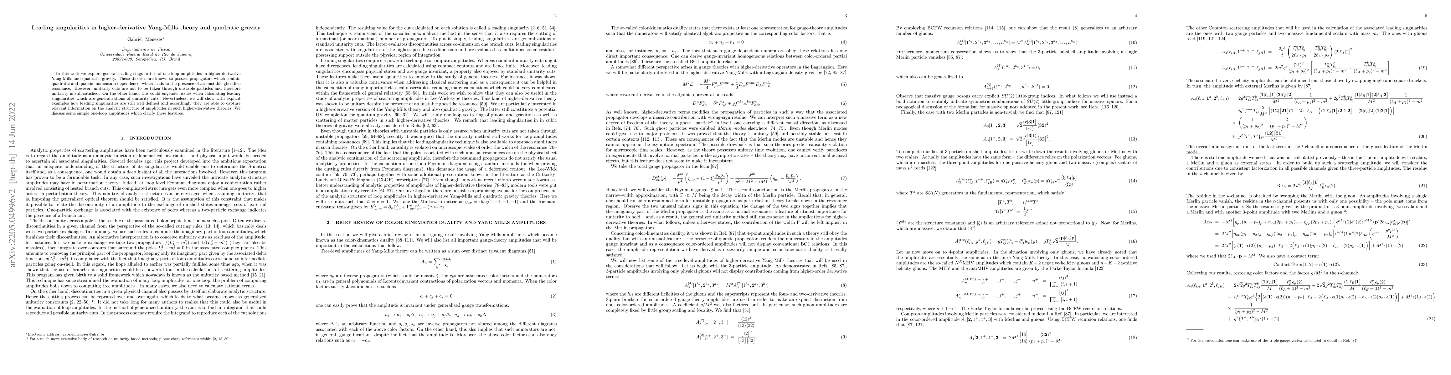 This paper investigates the leading singularities in one-loop amplitudes of higher-derivative Yang-Mills and quadratic gravity theories, revealing that despite the presence of ghostlike resonances, unitarity is preserved. The study demonstrates that leading singularities remain well-defined and provide meaningful insights into the analytic structure of amplitudes in these theories.