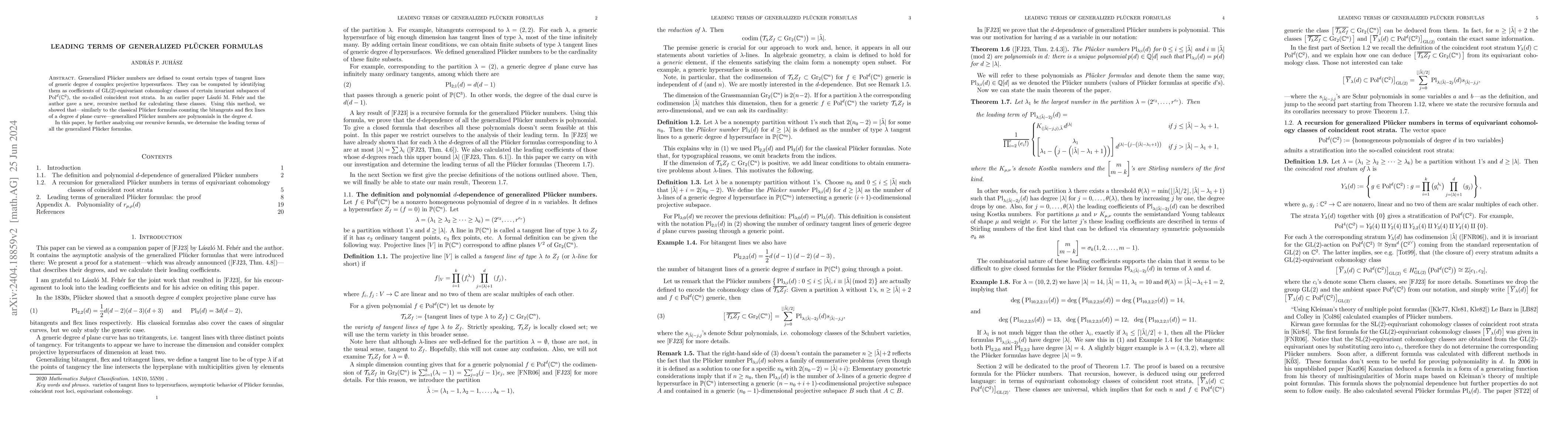 Generalized Pl\"ucker numbers are defined to count certain types of tangent lines of generic degree $d$ complex projective hypersurfaces. They can be computed by identifying them as coefficients of GL(2)-equivariant cohomology classes of certain invariant subspaces, the so-called coincident root strata, of the vector space of homogeneous degree $d$ complex polynomials in two variables. In an earlier paper L\'aszl\'o M. Feh\'er and the author gave a new, recursive method for calculating these classes. Using this method, we showed that -- similarly to the classical Pl\"ucker formulas counting the bitangents and flex lines of a degree $d$ plane curve -- generalized Pl\"ucker numbers are polynomials in the degree $d$. In this paper, by further analyzing our recursive formula, we determine the leading terms of all the generalized Pl\"ucker formulas.