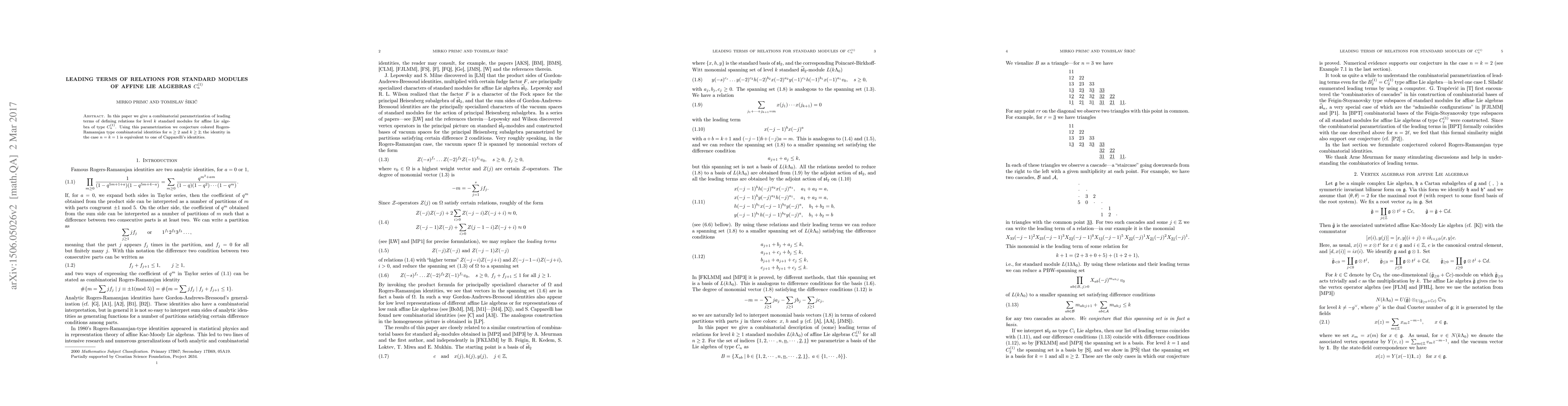 In this paper we give a combinatorial parametrization of leading terms of defining relations for level $k$ standard modules for affine Lie algebra of type $C_{n}\sp{(1)}$. Using this parametrization we conjecture colored Rogers-Ramanujan type combinatorial identities for $n\geq 2$ and $k\geq 2$; the identity in the case $n=k=1$ is equivalent to one of Capparelli's identities.