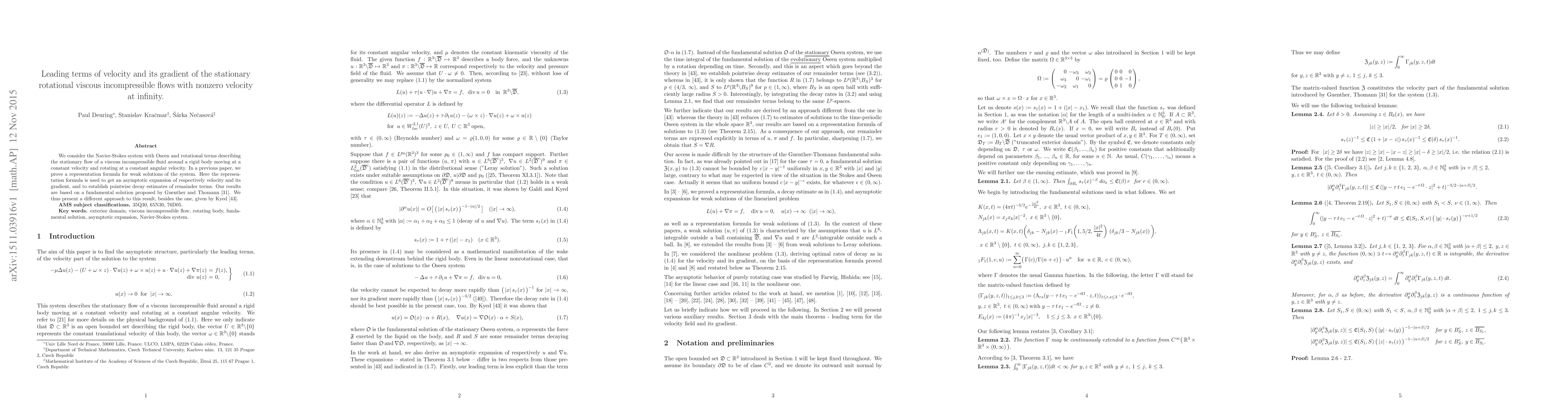 We consider the Navier-Stokes system with Oseen and rotational terms describing the stationary flow of a viscous incompressible fluid around a rigid body moving at a constant velocity and rotating at a constant angular velocity. In a previous paper, we prove a representation formula for weak solutions of the system. Here the representation formula is used to get an asymptotic expansion of respectively velocity and its gradient, and to establish pointwise decay estimates of remainder terms. Our results are based on a fundamental solution proposed by Guenther and Thomann J. Math. Fluid Mech., 8 (2006), 77-98. We thus present a different approach to this result, besides the one, given by Kyed J. Math. Soc. Japan, 66 (2014), 1-16.