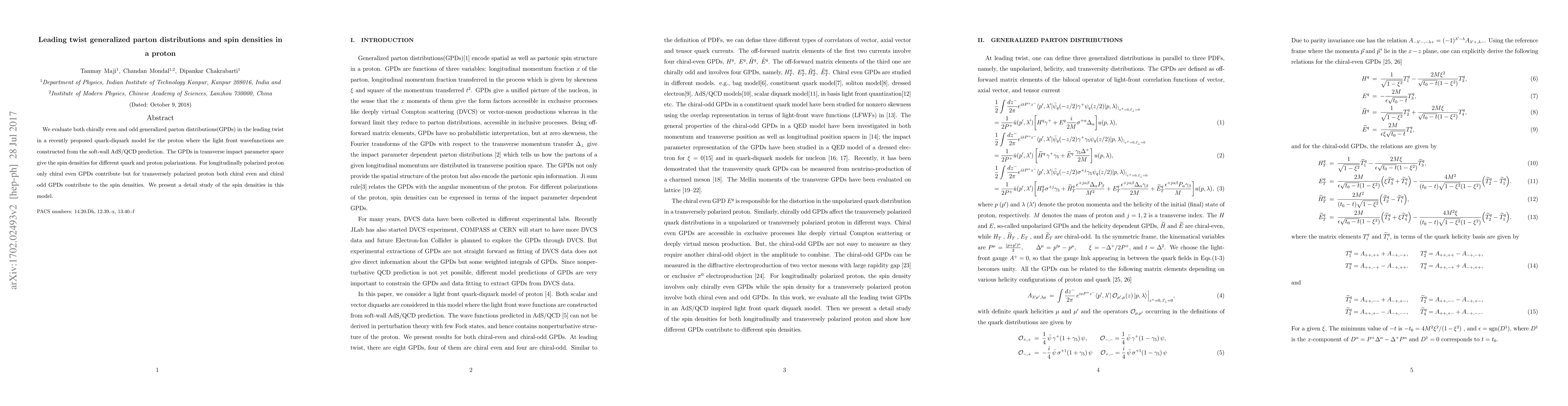 This paper evaluates chirally even and odd generalized parton distributions in a leading twist quark-diquark model for the proton, based on soft-wall AdS/QCD predictions. It provides detailed analysis of spin densities for different quark and proton polarizations, revealing contributions from both chiral types for transversely polarized protons.