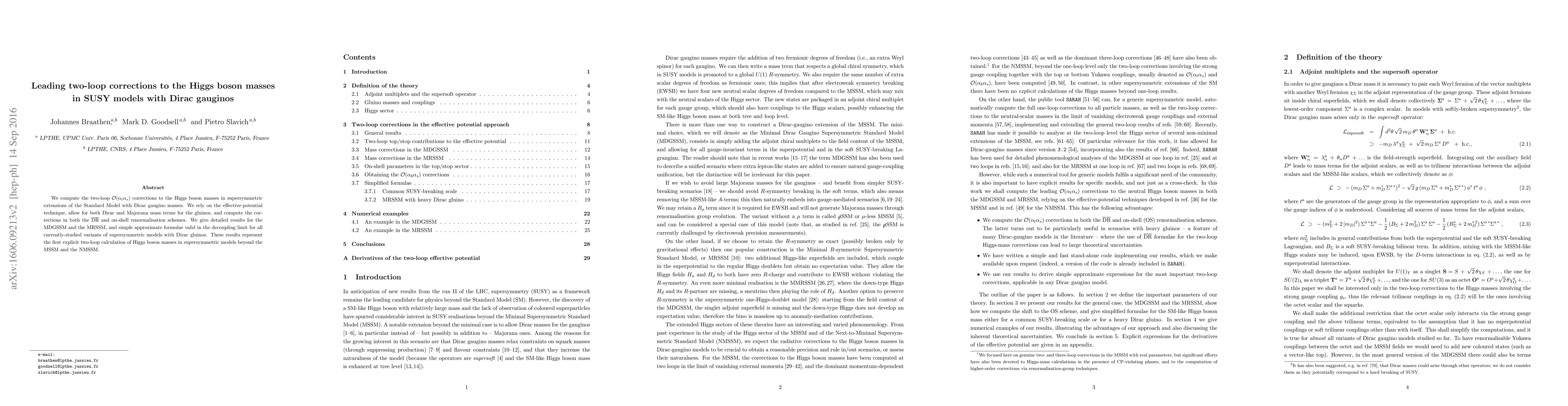 Summary: This paper presents the first explicit calculation of two-loop corrections to Higgs boson masses in supersymmetric models featuring Dirac gauginos, utilizing the effective-potential technique and providing detailed results for specific models and approximate formulae for general scenarios.