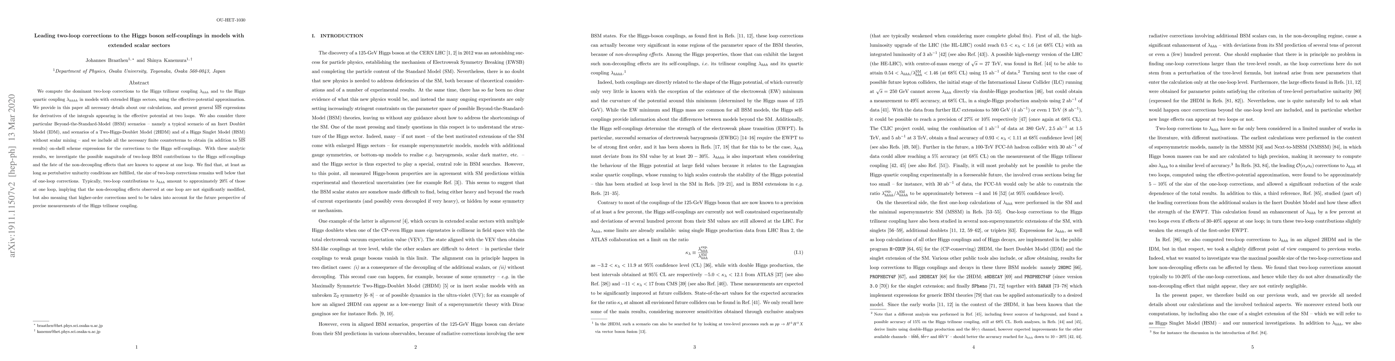 This paper calculates two-loop corrections to the Higgs trilinear and quartic couplings in extended scalar sector models, finding that two-loop contributions are about 20% of one-loop corrections, thus maintaining the non-decoupling effects observed at one loop.