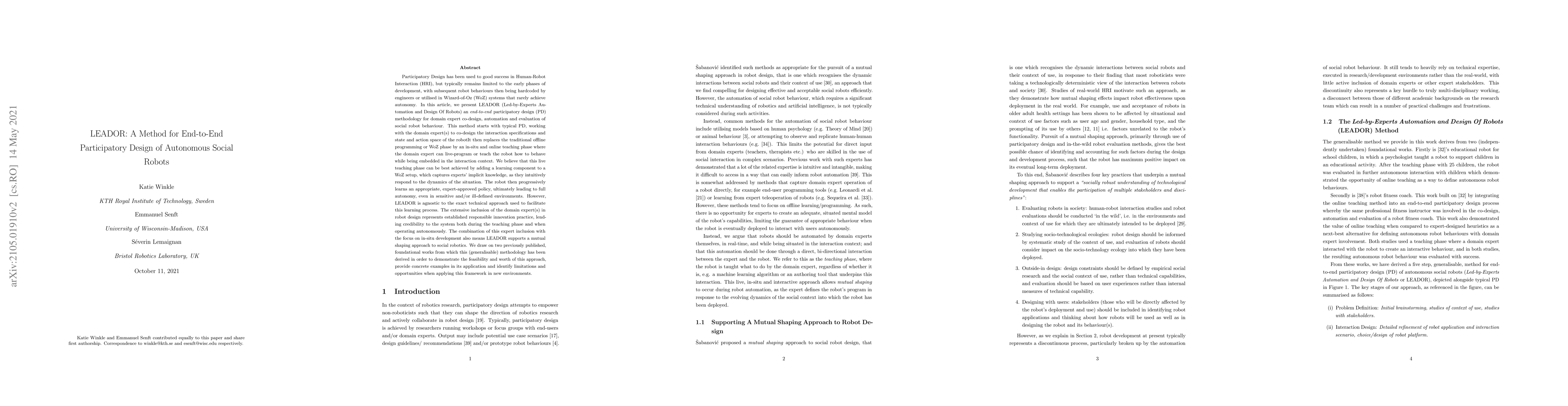 LEADOR is an end-to-end participatory design methodology for co-developing autonomous social robots with domain experts, enabling live programming and learning to achieve full robot autonomy. This approach emphasizes mutual shaping and responsible innovation through extensive expert involvement.