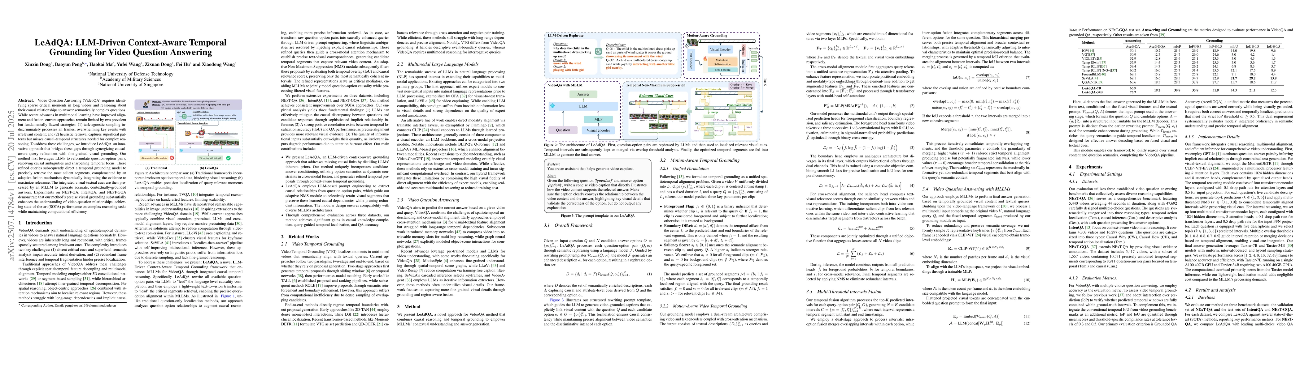 Video Question Answering (VideoQA) requires identifying sparse critical moments in long videos and reasoning about their causal relationships to answer semantically complex questions. While recent advances in multimodal learning have improved alignment and fusion, current approaches remain limited by two prevalent but fundamentally flawed strategies: (1) task-agnostic sampling indiscriminately processes all frames, overwhelming key events with irrelevant content; and (2) heuristic retrieval captures superficial patterns but misses causal-temporal structures needed for complex reasoning. To address these challenges, we introduce LeAdQA, an innovative approach that bridges these gaps through synergizing causal-aware query refinement with fine-grained visual grounding. Our method first leverages LLMs to reformulate question-option pairs, resolving causal ambiguities and sharpening temporal focus. These refined queries subsequently direct a temporal grounding model to precisely retrieve the most salient segments, complemented by an adaptive fusion mechanism dynamically integrating the evidence to maximize relevance. The integrated visual-textual cues are then processed by an MLLM to generate accurate, contextually-grounded answers. Experiments on NExT-QA, IntentQA, and NExT-GQA demonstrate that our method's precise visual grounding substantially enhances the understanding of video-question relationships, achieving state-of-the-art (SOTA) performance on complex reasoning tasks while maintaining computational efficiency.