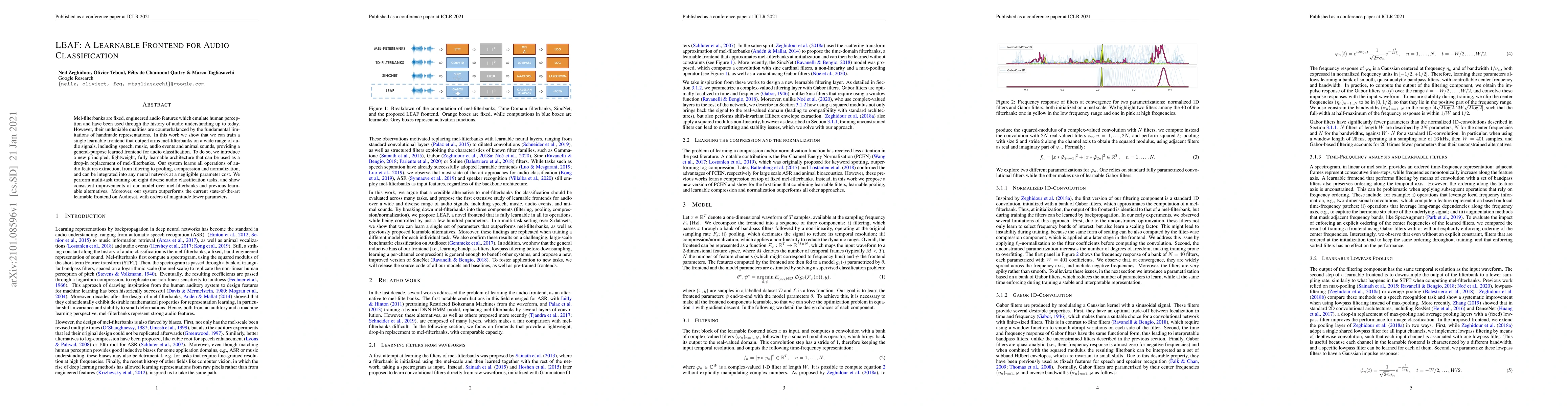 The paper proposes LEAF, a learnable frontend architecture that outperforms traditional mel-filterbanks in audio classification across various signal types. LEAF trains its entire feature extraction process, leading to better performance and significantly fewer parameters compared to previous learnable methods.