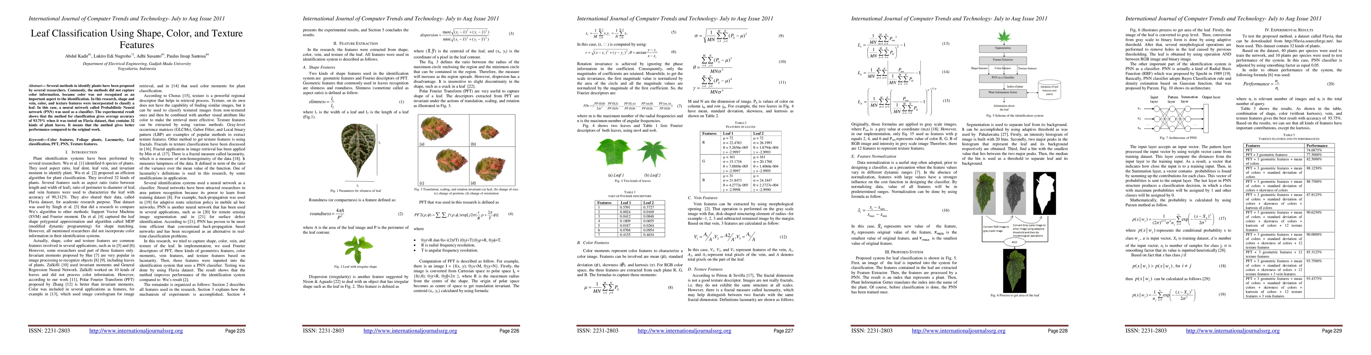 This research proposes a leaf classification method using shape, color, and texture features, employing a Probabilistic Neural Network (PNN) classifier. The method achieves an average accuracy of 93.75% on the Flavia dataset, outperforming previous methods that neglected color information.