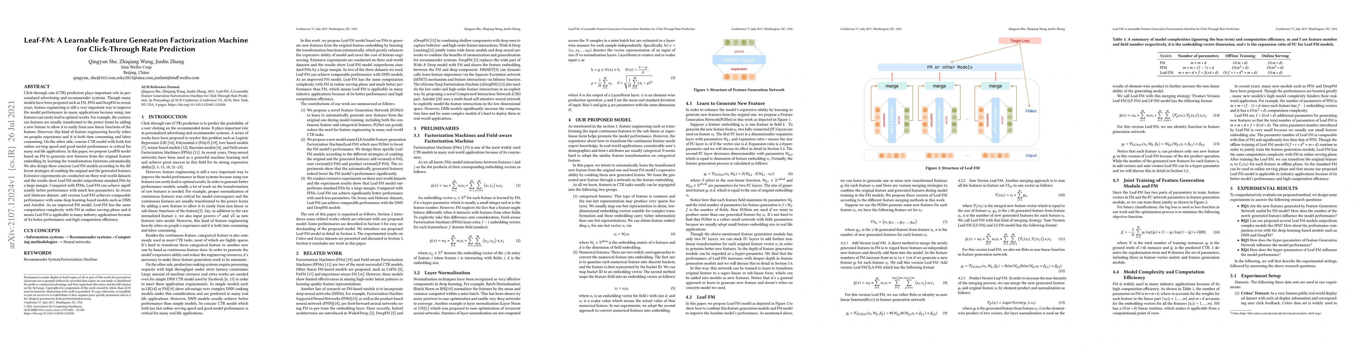 Click-through rate (CTR) prediction plays important role in personalized advertising and recommender systems. Though many models have been proposed such as FM, FFM and DeepFM in recent years, feature engineering is still a very important way to improve the model performance in many applications because using raw features can rarely lead to optimal results. For example, the continuous features are usually transformed to the power forms by adding a new feature to allow it to easily form non-linear functions of the feature. However, this kind of feature engineering heavily relies on peoples experience and it is both time consuming and labor consuming. On the other side, concise CTR model with both fast online serving speed and good model performance is critical for many real life applications. In this paper, we propose LeafFM model based on FM to generate new features from the original feature embedding by learning the transformation functions automatically. We also design three concrete Leaf-FM models according to the different strategies of combing the original and the generated features. Extensive experiments are conducted on three real-world datasets and the results show Leaf-FM model outperforms standard FMs by a large margin. Compared with FFMs, Leaf-FM can achieve significantly better performance with much less parameters. In Avazu and Malware dataset, add version Leaf-FM achieves comparable performance with some deep learning based models such as DNN and AutoInt. As an improved FM model, Leaf-FM has the same computation complexity with FM in online serving phase and it means Leaf-FM is applicable in many industry applications because of its better performance and high computation efficiency.