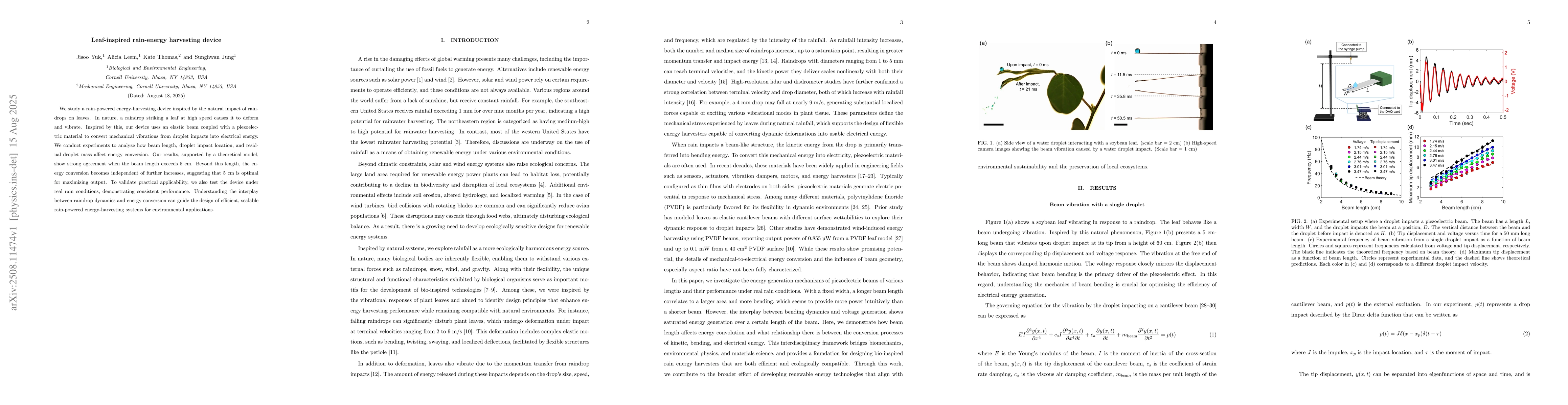 We study a rain-powered energy-harvesting device inspired by the natural impact of raindrops on leaves. In nature, a raindrop striking a leaf at high speed causes it to deform and vibrate. Inspired by this, our device uses an elastic beam coupled with a piezoelectric material to convert mechanical vibrations from droplet impacts into electrical energy. We conduct experiments to analyze how beam length, droplet impact location, and residual droplet mass affect energy conversion. Our results, supported by a theoretical model, show strong agreement when the beam length exceeds 5 cm. Beyond this length, the energy conversion becomes independent of further increases, suggesting that 5 cm is optimal for maximizing output. To validate practical applicability, we also test the device under real rain conditions, demonstrating consistent performance. Understanding the interplay between raindrop dynamics and energy conversion can guide the design of efficient, scalable rain-powered energy-harvesting systems for environmental applications.