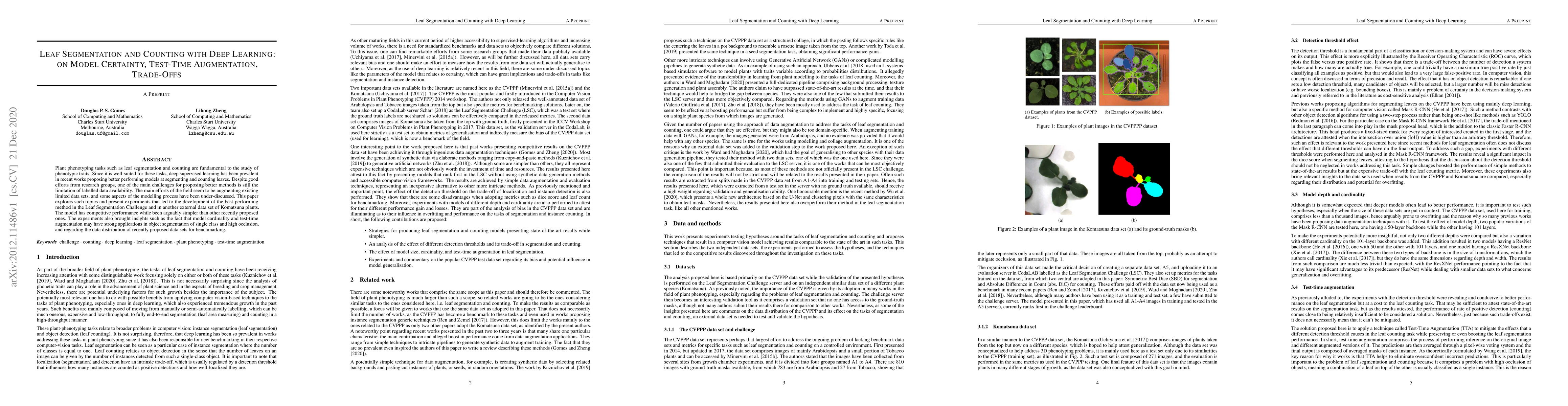 This paper investigates deep learning methods for leaf segmentation and counting, focusing on model certainty, test-time augmentation, and trade-offs. The proposed model achieves top performance in the Leaf Segmentation Challenge and on an external dataset, highlighting the benefits of model simplicity and the effectiveness of test-time augmentation in handling occlusions.