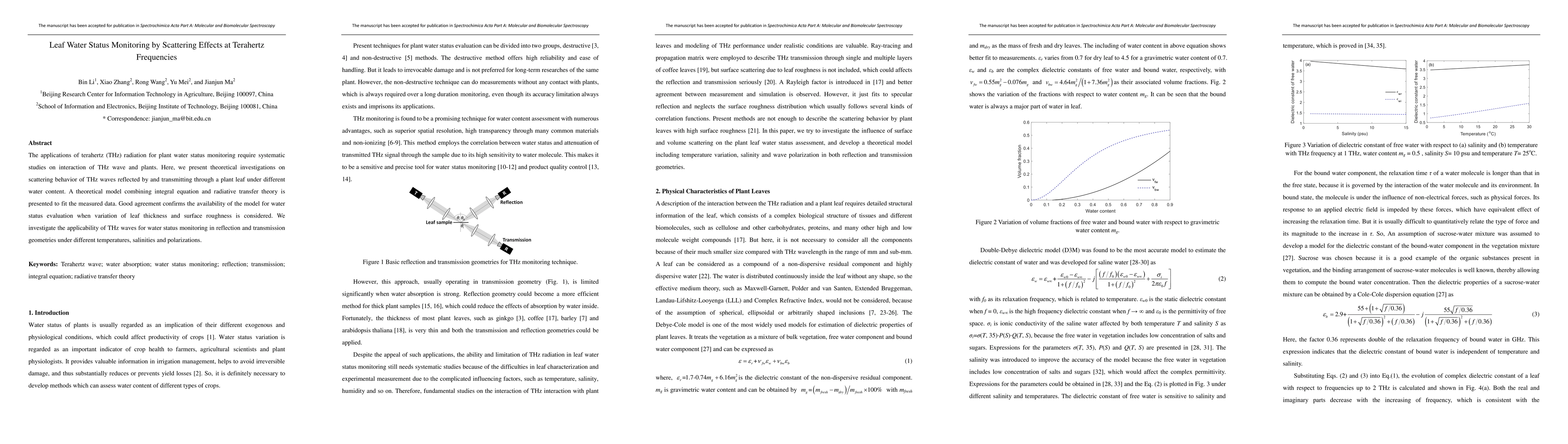 This paper investigates the interaction of terahertz (THz) waves with plant leaves to monitor water status, presenting a theoretical model that accurately fits measured data. The study explores THz wave scattering behavior under varying leaf water content, thickness, and surface roughness, and evaluates its applicability across different environmental conditions.
