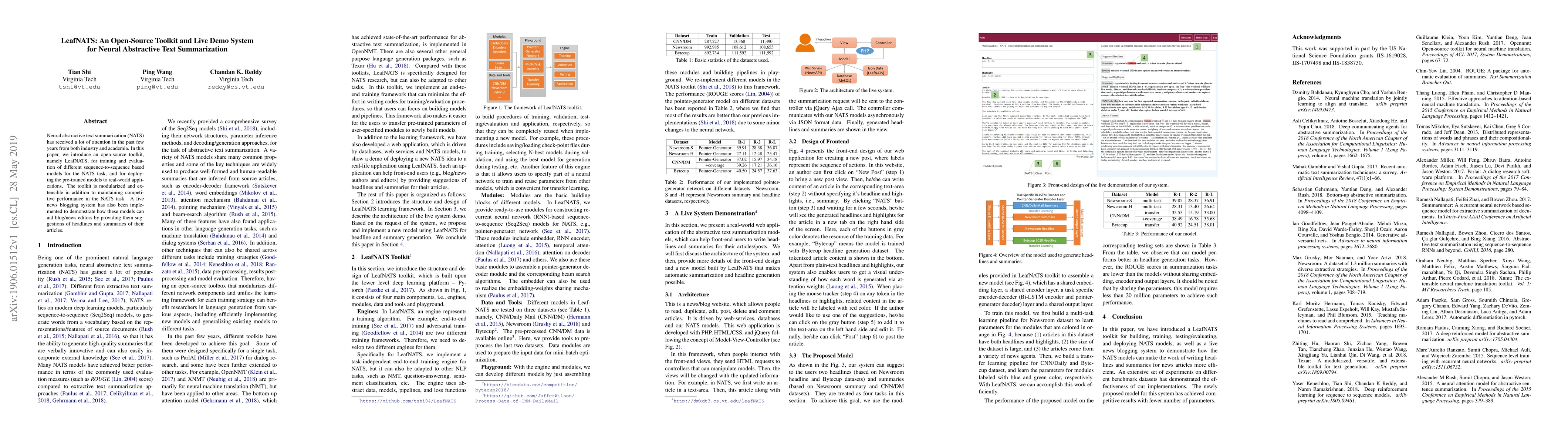 LeafNATS is an open-source toolkit for training and evaluating sequence-to-sequence models for neural abstractive text summarization (NATS), featuring modularity and competitive performance. It also includes a live demo system for real-world applications, such as aiding news bloggers with headline and summary suggestions.