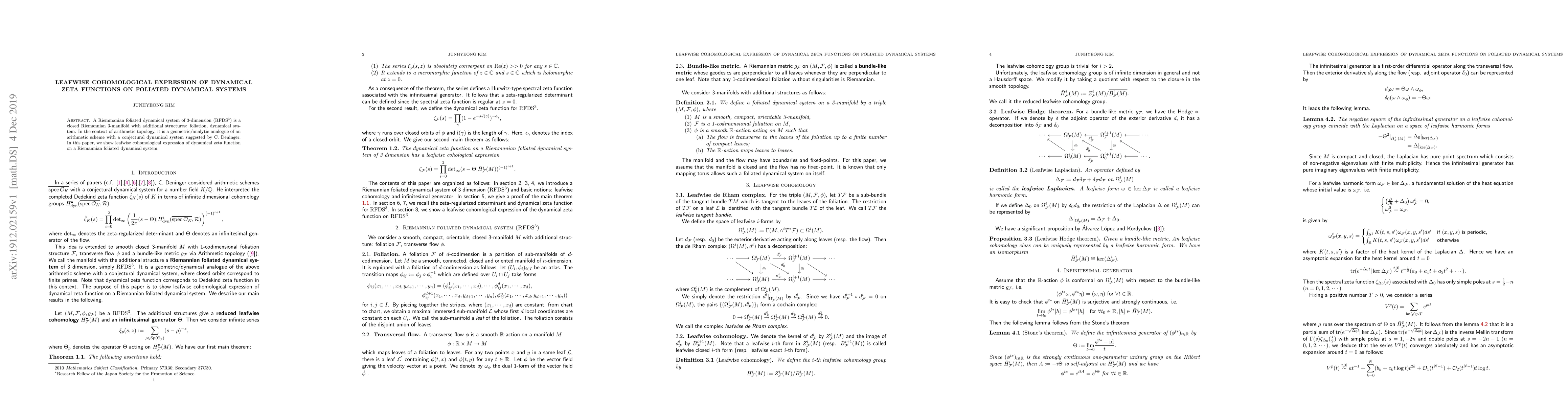 This paper presents a leafwise cohomological expression for the dynamical zeta function of a Riemannian foliated dynamical system (RFDS³), linking it to arithmetic topology and the conjectured dynamical systems of C. Deninger. The findings provide a geometric/analytic analogue for arithmetic schemes.
