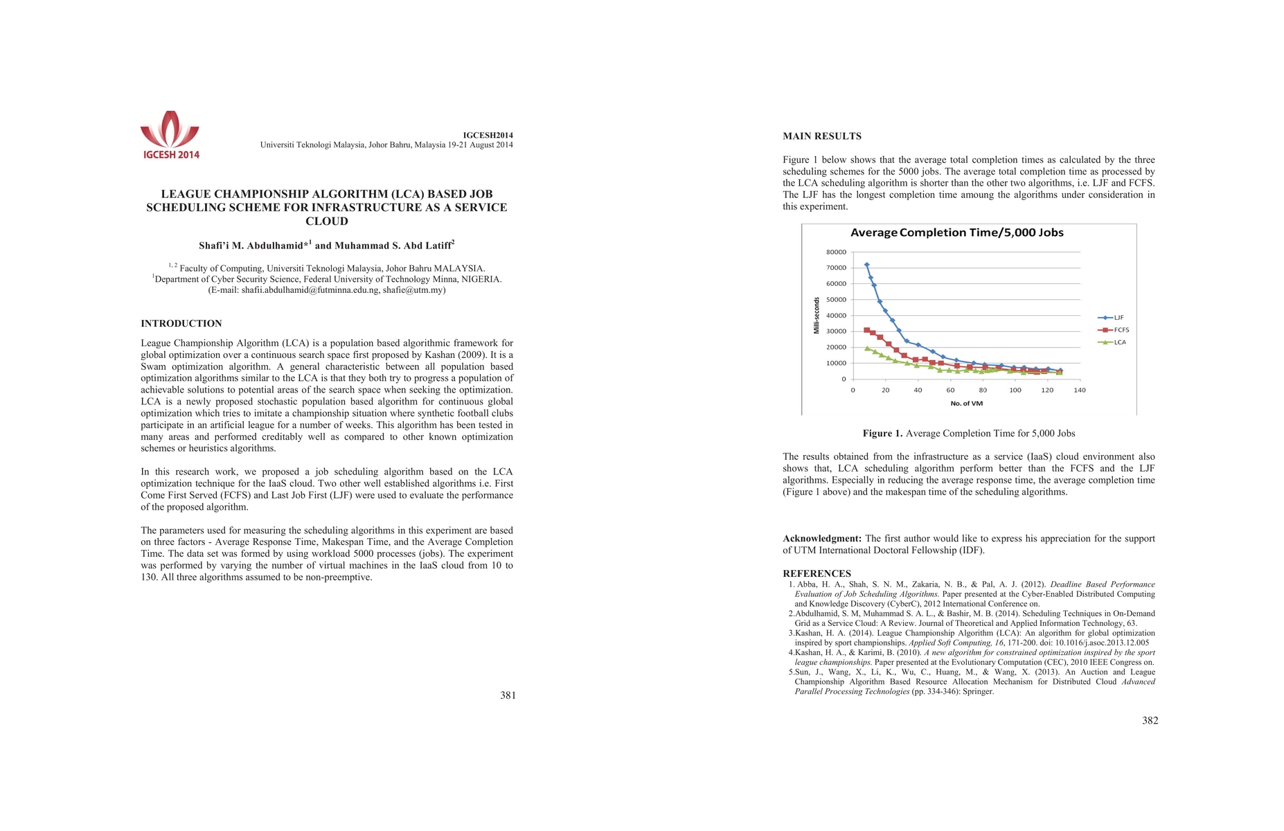 League Championship Algorithm (LCA) is a sports-inspired population based algorithmic framework for global optimization over a continuous search space first proposed by Ali Husseinzadeh Kashan in the year 2009. A common characteristic between all population based optimization algorithms similar to the LCA is that, they attemt to move a population of achievable solutions to potential areas of the search space during optimization. In this paper, we proposed a job scheduling algorithm based on the L CA optimization technique for the infrastructure as a service (IaaS) cloud. Three other established algorithms i.e. First Come First Served (FCFS), Last Job First (LJF) and Best Effort First (BEF) were used to evaluate the performance of the proposed algorithm. All four algorithms assumed to be non-preemptive. The parameters used for this experiment are the average response time and the average completion time. The results obtained shows that, LCA scheduling algorithm perform moderately better than the other algorithms as the number of virtual machines increases.