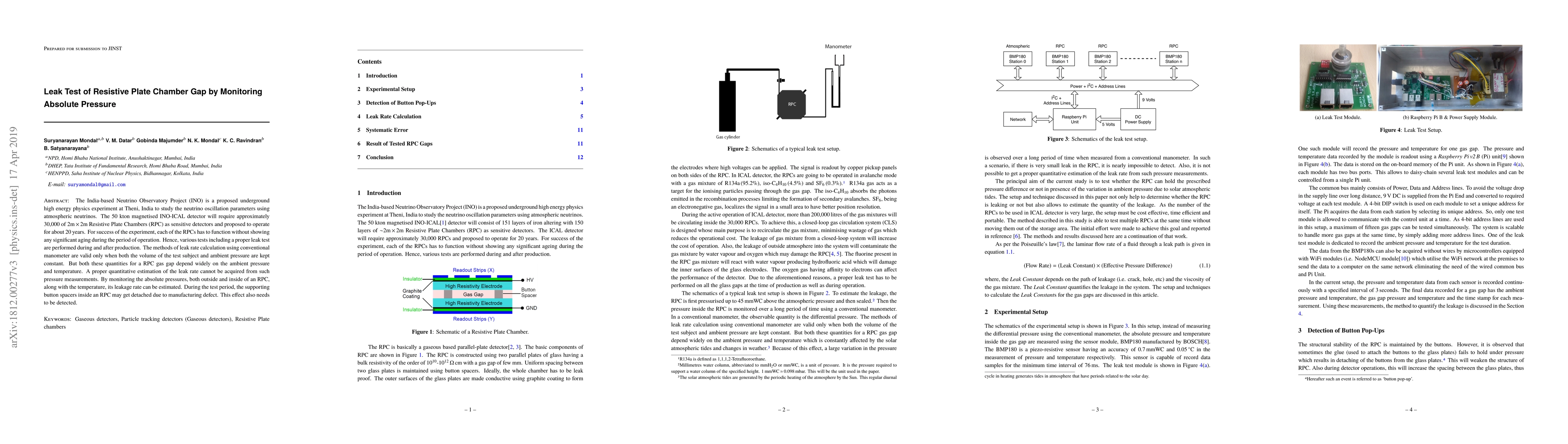 The India-based Neutrino Observatory Project (INO) is a proposed underground high energy physics experiment at Theni, India to study the neutrino oscillation parameters using atmospheric neutrinos. The 50 kton magnetised INO-ICAL detector will require approximately 30,000 of 2m$\times$2m Resistive Plate Chambers (RPC) as sensitive detectors and proposed to operate for about 20 years. For success of the experiment, each of the RPCs has to function without showing any significant aging during the period of operation. Hence, various tests including a proper leak test are performed during and after production. The methods of leak rate calculation using conventional manometer are valid only when both the volume of the test subject and ambient pressure are kept constant. But both these quantities for a RPC gas gap depend widely on the ambient pressure and temperature. A proper quantitative estimation of the leak rate cannot be acquired from such pressure measurements. By monitoring the absolute pressures, both outside and inside of an RPC, along with the temperature, its leakage rate can be estimated. During the test period, the supporting button spacers inside an RPC may get detached due to manufacturing defect. This effect also needs to be detected.