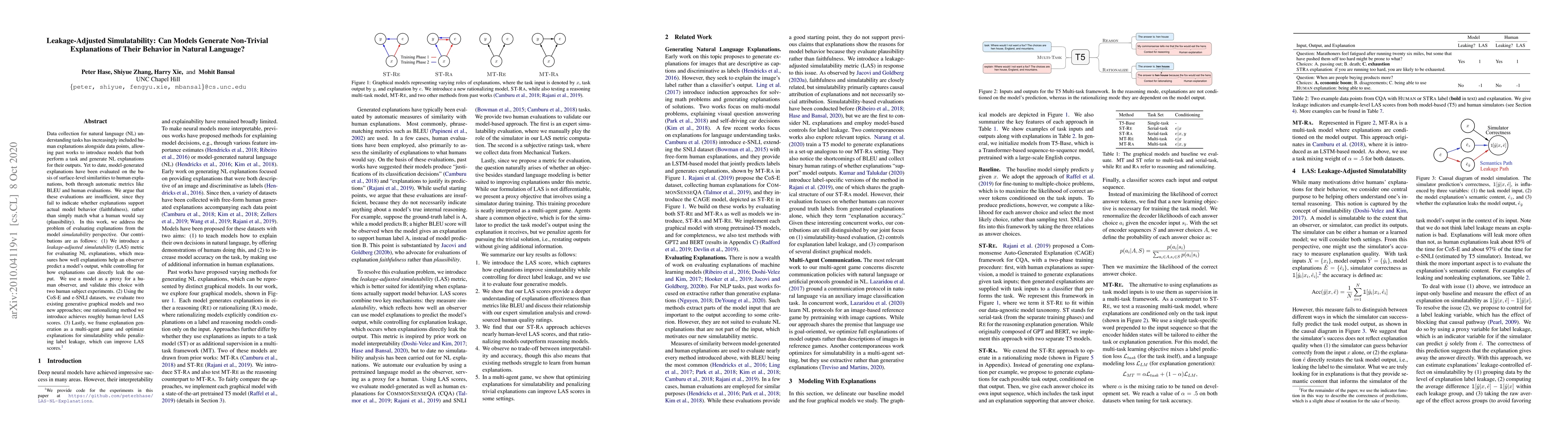 This paper introduces a leakage-adjusted simulatability (LAS) metric to evaluate natural language explanations generated by models, focusing on their ability to predict model behavior rather than merely matching human explanations. The authors demonstrate that existing evaluation methods are insufficient and propose a new approach that optimizes explanations for simulatability while penalizing label leakage.