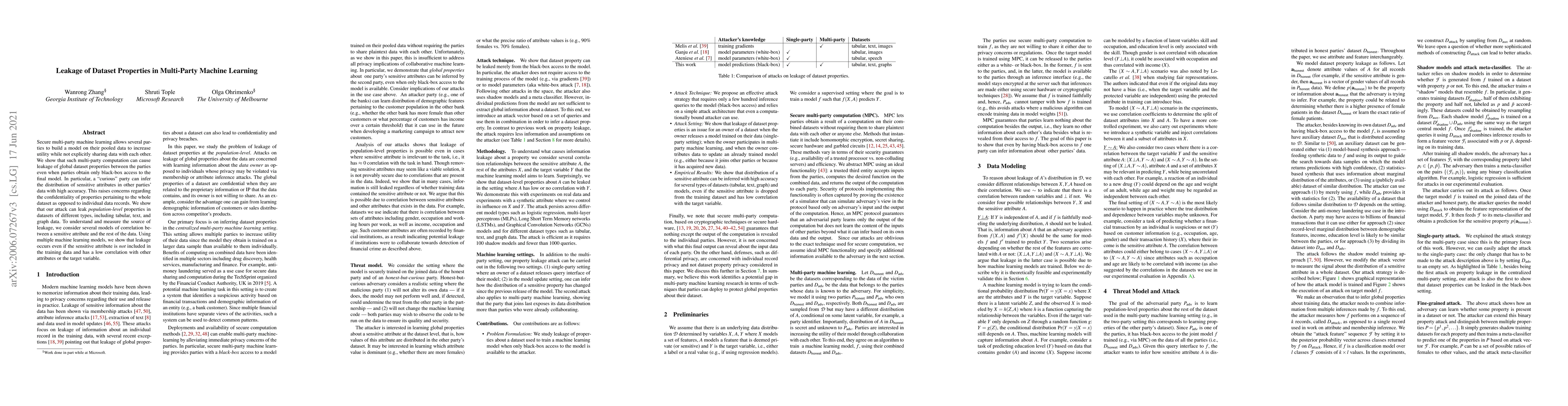 Multi-party machine learning can leak global dataset properties between parties, compromising confidentiality, even with black-box access to the final model.