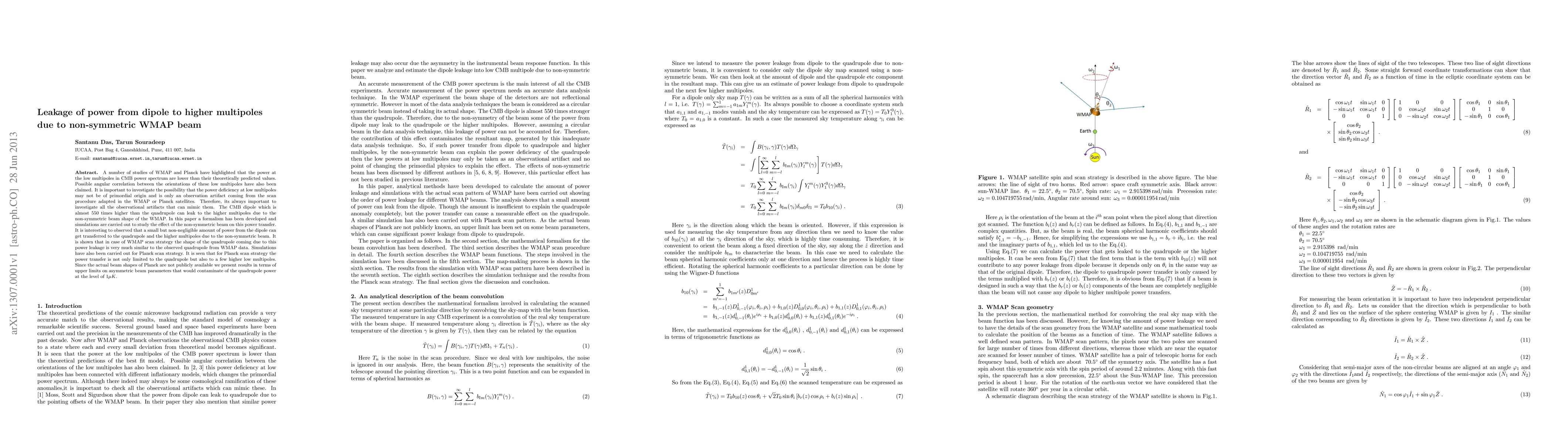 This paper investigates how the non-symmetric WMAP beam shape can cause leakage of power from the CMB dipole to higher multipoles, potentially mimicking primordial signals. Simulations show that this leakage can transfer a small but significant amount of power to the quadrupole and higher multipoles, resembling the observed CMB power spectrum anomalies.