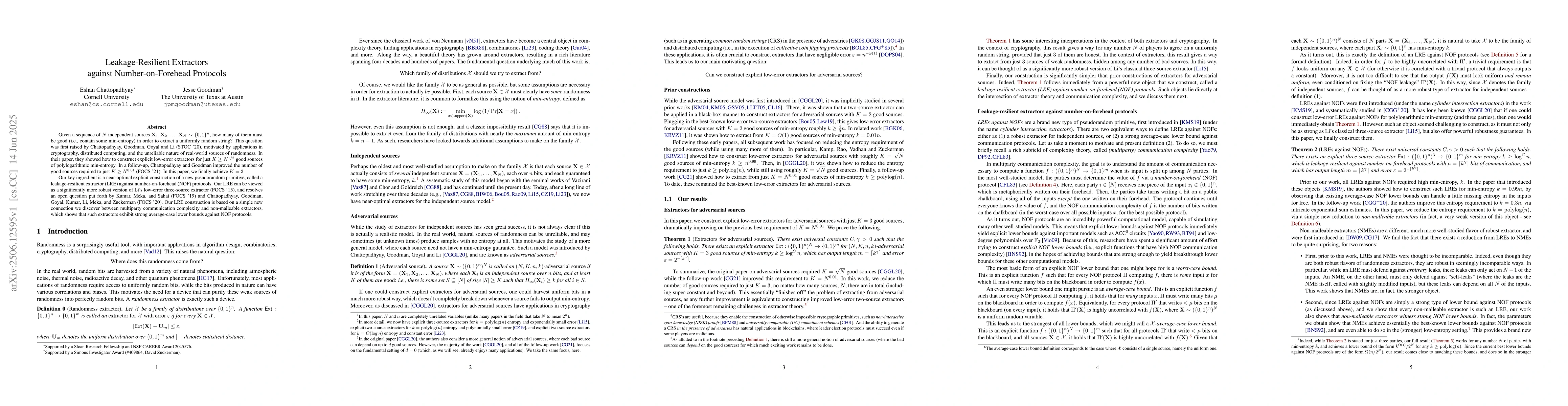 Given a sequence of $N$ independent sources $\mathbf{X}_1,\mathbf{X}_2,\dots,\mathbf{X}_N\sim\{0,1\}^n$, how many of them must be good (i.e., contain some min-entropy) in order to extract a uniformly random string? This question was first raised by Chattopadhyay, Goodman, Goyal and Li (STOC '20), motivated by applications in cryptography, distributed computing, and the unreliable nature of real-world sources of randomness. In their paper, they showed how to construct explicit low-error extractors for just $K \geq N^{1/2}$ good sources of polylogarithmic min-entropy. In a follow-up, Chattopadhyay and Goodman improved the number of good sources required to just $K \geq N^{0.01}$ (FOCS '21). In this paper, we finally achieve $K=3$. Our key ingredient is a near-optimal explicit construction of a new pseudorandom primitive, called a leakage-resilient extractor (LRE) against number-on-forehead (NOF) protocols. Our LRE can be viewed as a significantly more robust version of Li's low-error three-source extractor (FOCS '15), and resolves an open question put forth by Kumar, Meka, and Sahai (FOCS '19) and Chattopadhyay, Goodman, Goyal, Kumar, Li, Meka, and Zuckerman (FOCS '20). Our LRE construction is based on a simple new connection we discover between multiparty communication complexity and non-malleable extractors, which shows that such extractors exhibit strong average-case lower bounds against NOF protocols.