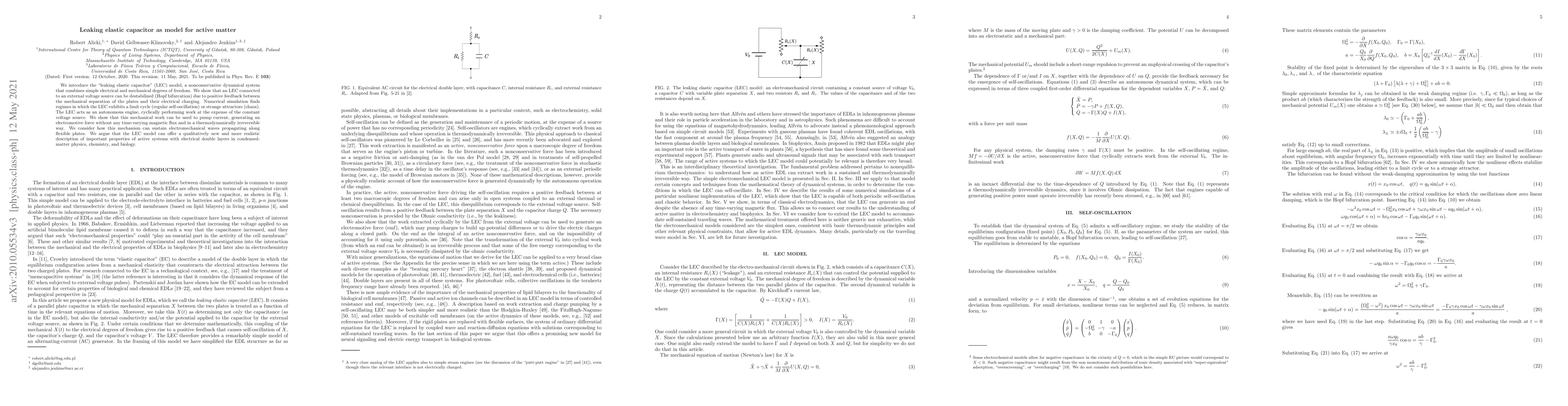 The "leaking elastic capacitor" (LEC) model demonstrates self-oscillation and chaos through positive feedback between mechanical and electrical dynamics, functioning as an autonomous engine that generates electromotive force and sustains electromechanical waves, offering a novel perspective on active matter systems.