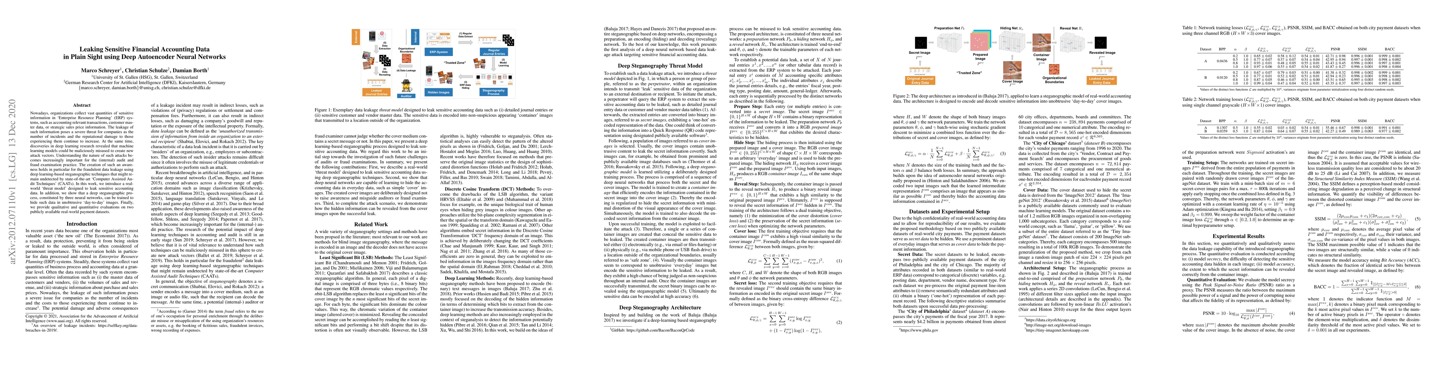 Nowadays, organizations collect vast quantities of sensitive information in `Enterprise Resource Planning' (ERP) systems, such as accounting relevant transactions, customer master data, or strategic sales price information. The leakage of such information poses a severe threat for companies as the number of incidents and the reputational damage to those experiencing them continue to increase. At the same time, discoveries in deep learning research revealed that machine learning models could be maliciously misused to create new attack vectors. Understanding the nature of such attacks becomes increasingly important for the (internal) audit and fraud examination practice. The creation of such an awareness holds in particular for the fraudulent data leakage using deep learning-based steganographic techniques that might remain undetected by state-of-the-art `Computer Assisted Audit Techniques' (CAATs). In this work, we introduce a real-world `threat model' designed to leak sensitive accounting data. In addition, we show that a deep steganographic process, constituted by three neural networks, can be trained to hide such data in unobtrusive `day-to-day' images. Finally, we provide qualitative and quantitative evaluations on two publicly available real-world payment datasets.