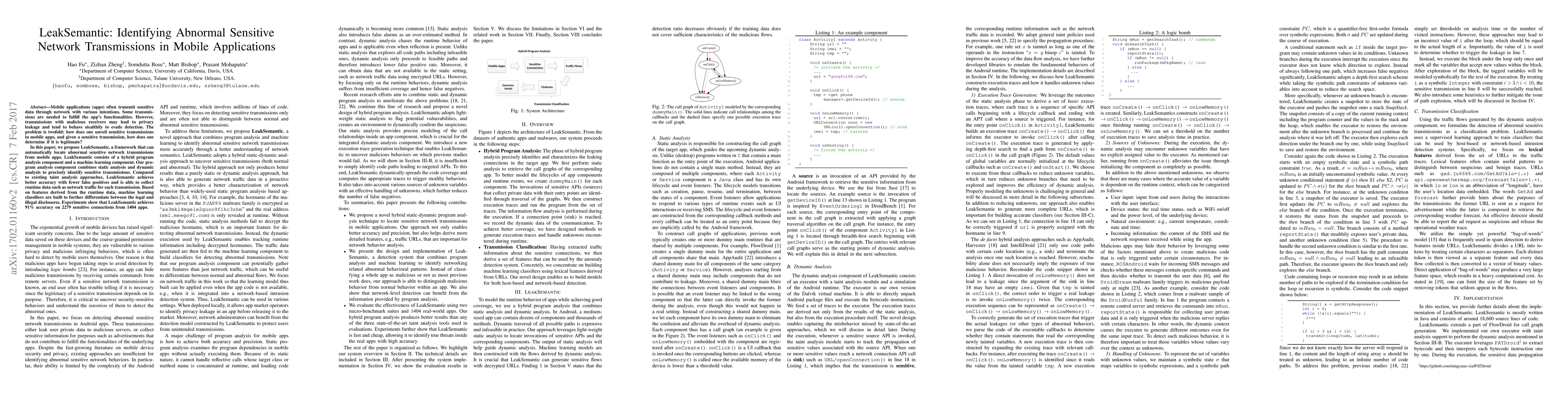 LeakSemantic is a framework that combines hybrid program analysis and machine learning to automatically detect abnormal sensitive network transmissions in mobile apps. It achieves high accuracy in distinguishing legitimate from malicious transmissions, demonstrating 91% accuracy on a dataset of 2279 connections from 1404 apps.